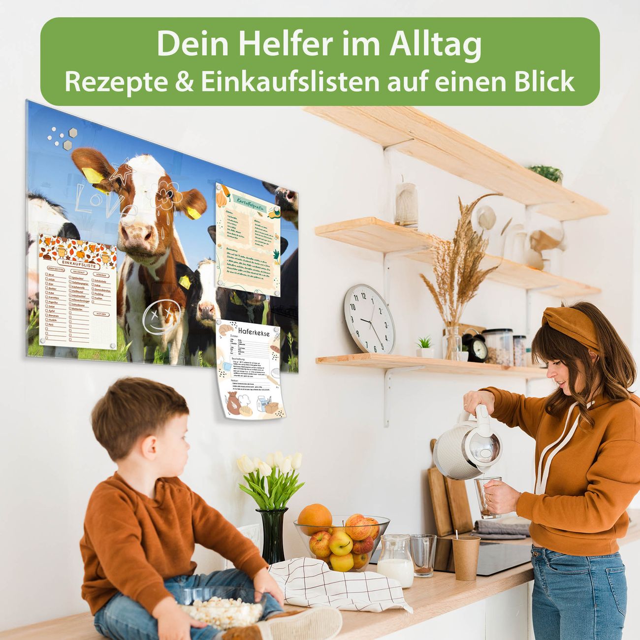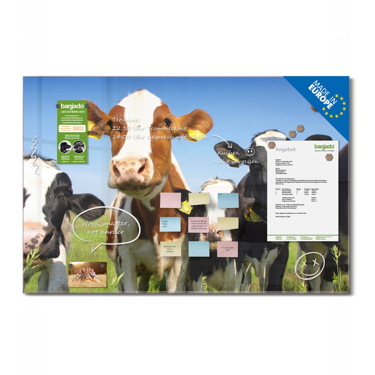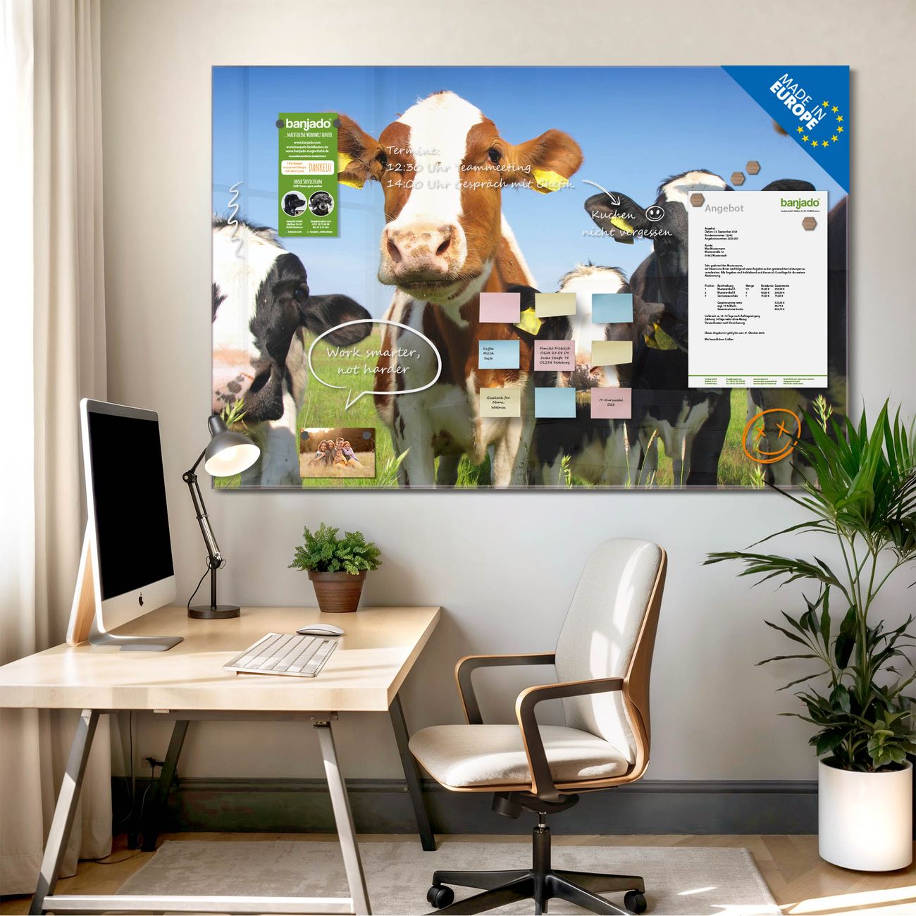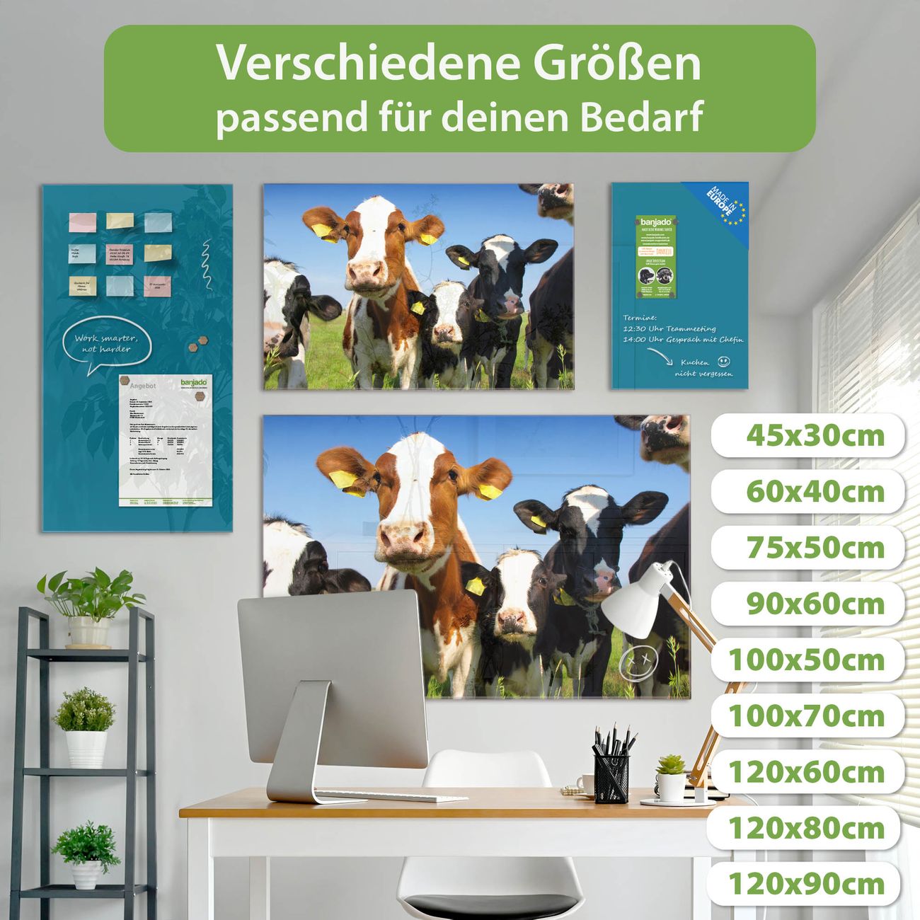 Ein Stück Design, das Ihren Alltag organisiert. Schreiben, heften, inspirieren - alles an einem Ort. Qualität, die man spürt. Montage leicht gemacht. Handwerk mit Herz - veredelt in Sachsen. Einzigartiges Design mit Motiv Motiv Kühe Beschreibbare Glasoberfläche, leicht zu reinigen Starke Magnetkraft durch Stahlrückwand Inklusive 4 Neodym-Magneten Flexible Montageoptionen Handveredelt in Sachsen - Qualität, die bleibt