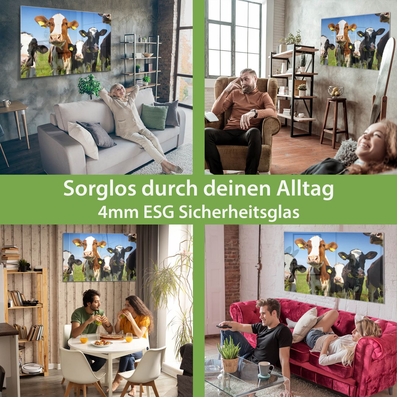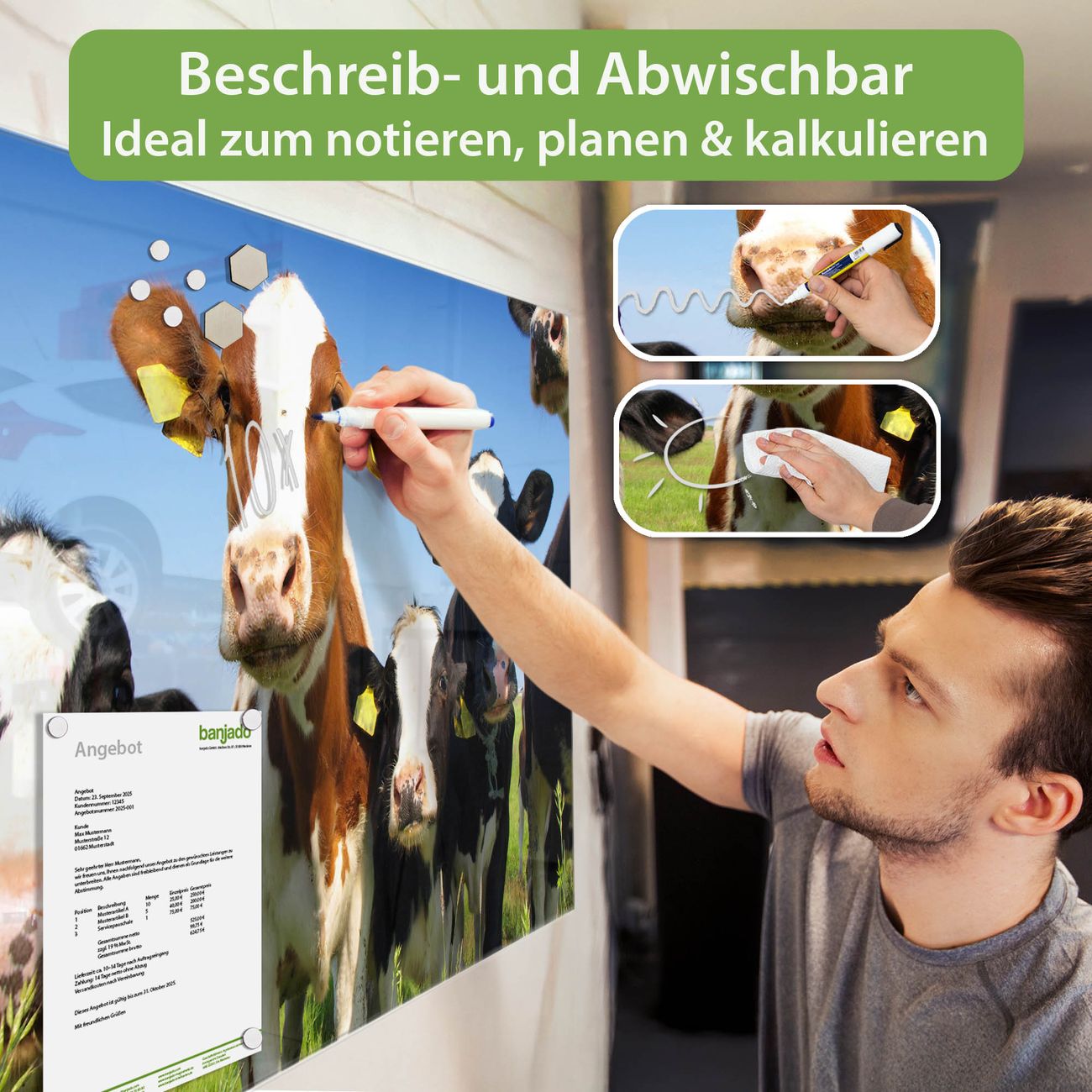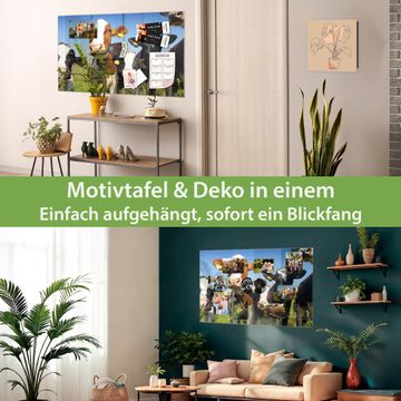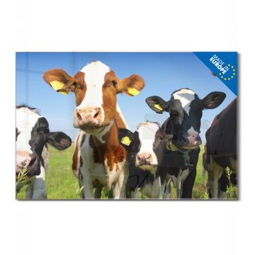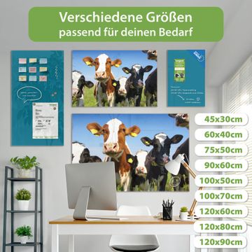 Material: 4mm Sicherheitsglas mit Metallrückwand Eigenschaften: beschreibbar, magnetisch, kratzfest Maße: 120x80x0,6cm, 14,40kg schwer Motiv Nummer 10225 Kühe Zubehör: inklusive 4 Neodym-Magnete