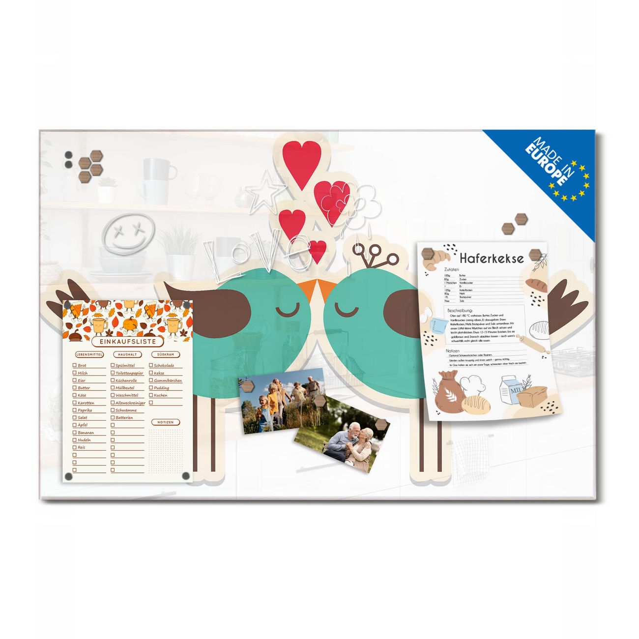 Ein Stück Design, das Ihren Alltag organisiert. Schreiben, heften, inspirieren - alles an einem Ort. Qualität, die man spürt. Montage leicht gemacht. Handwerk mit Herz - veredelt in Sachsen. Einzigartiges Design mit Motiv Motiv Küsschen Beschreibbare Glasoberfläche, leicht zu reinigen Starke Magnetkraft durch Stahlrückwand Inklusive 4 Neodym-Magneten Flexible Montageoptionen Handveredelt in Sachsen - Qualität, die bleibt
