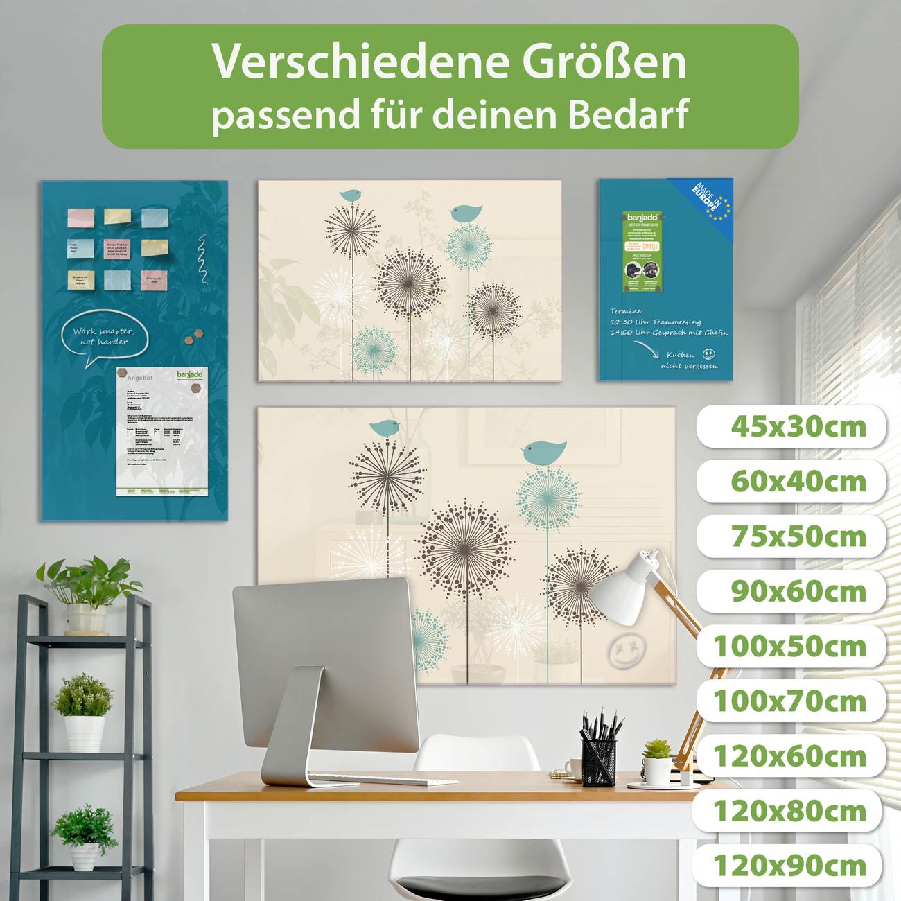 Material: 4mm Sicherheitsglas mit Metallrückwand Eigenschaften: beschreibbar, magnetisch, kratzfest Maße: 120x80x0,6cm, 14,40kg schwer Motiv Nummer 10751 Kugelfontänen Zubehör: inklusive 4 Neodym-Magnete