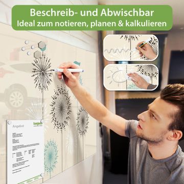 Auf der glatten Glasoberfläche lassen sich Termine, Rezepte oder Notizen ganz einfach mit Kreidestiften festhalten und rückstandslos entfernen. Starke Neodym-Magnete halten Ihre wichtigsten Erinnerungen sicher an Ort und Stelle. So entsteht Ihre ganz persönliche Ideenwand - jeden Tag neu.
