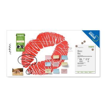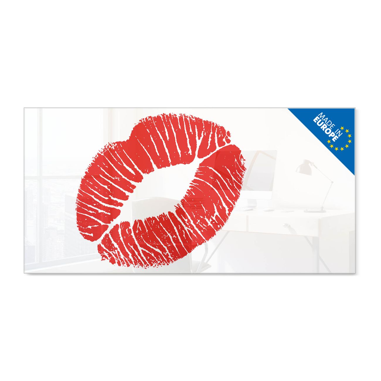Material: 4mm Sicherheitsglas mit Metallrückwand Eigenschaften: beschreibbar, magnetisch, kratzfest Maße: 120x60x0,6cm, 10,80kg schwer Motiv Nummer 10264 Kussmund Zubehör: inklusive 4 Neodym-Magnete