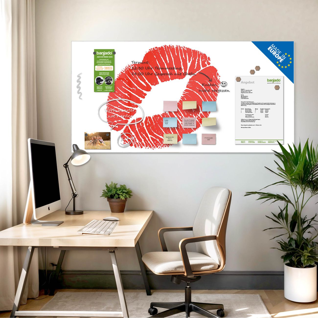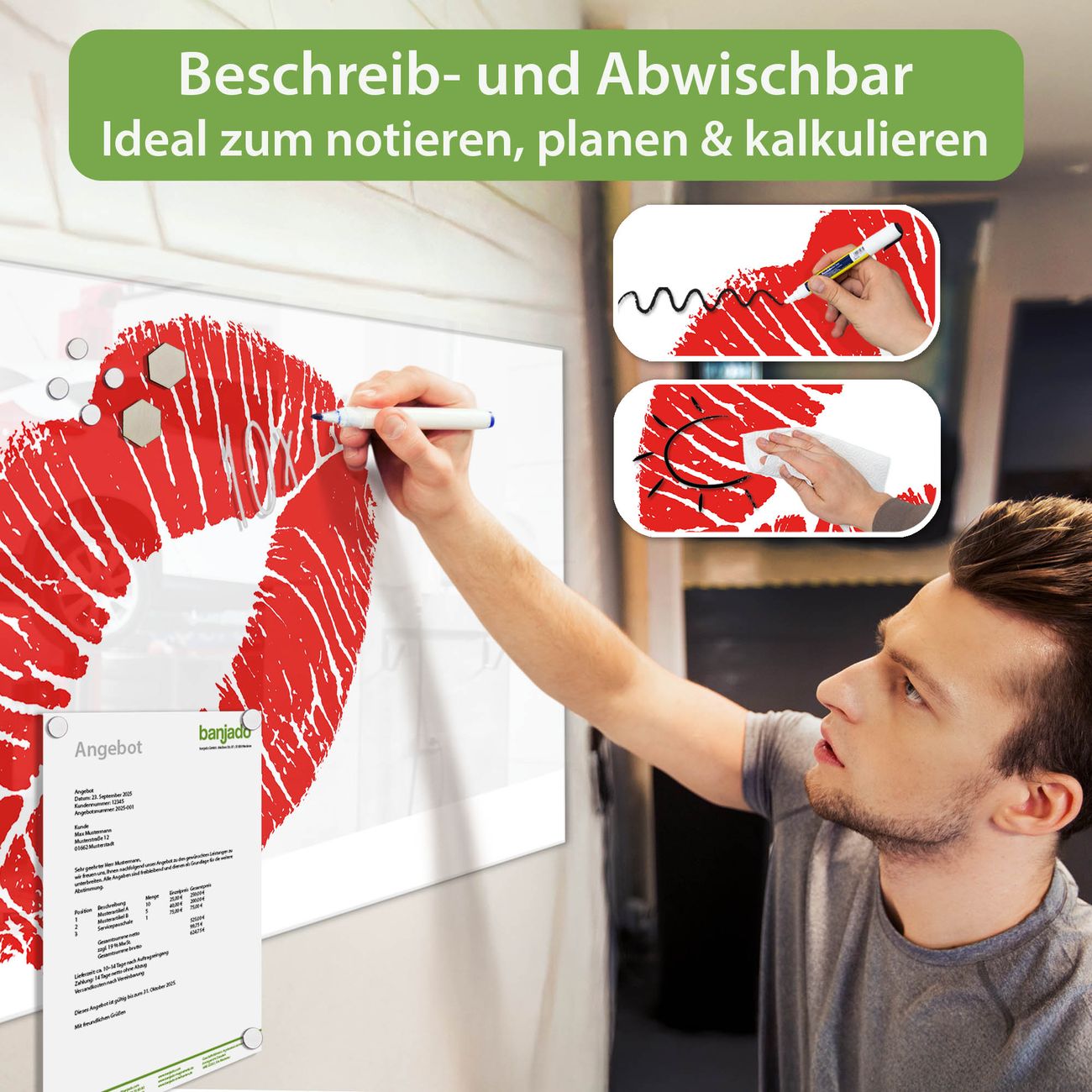 Jede Glas Magnettafel wird in unserer Werkstatt von Hand gefertigt und sorgfältig geprüft. So erhalten Sie ein echtes Qualitätsprodukt, das Funktion und Ästhetik perfekt vereint.?? Warum banjado?