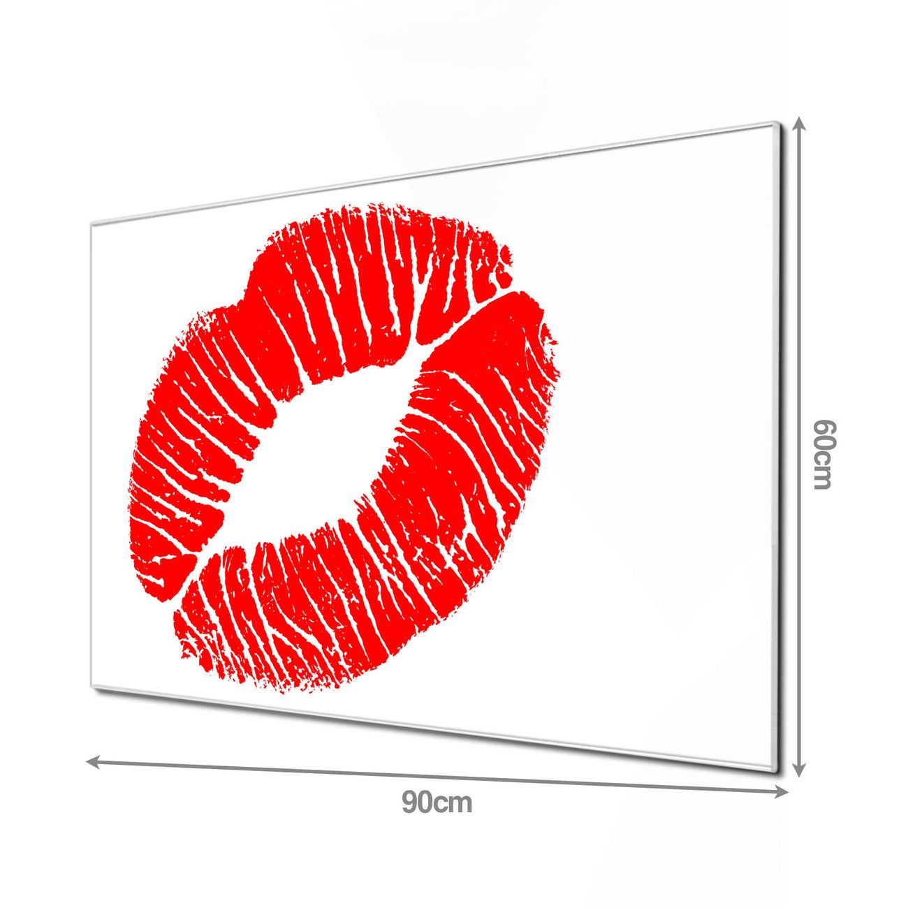 Material: 4mm Sicherheitsglas mit Metallrückwand Eigenschaften: beschreibbar, magnetisch, kratzfest Maße: 90x60x0,6cm, 8,10kg schwer Motiv Nummer 10264 Kussmund Zubehör: inklusive 4 Neodym-Magnete