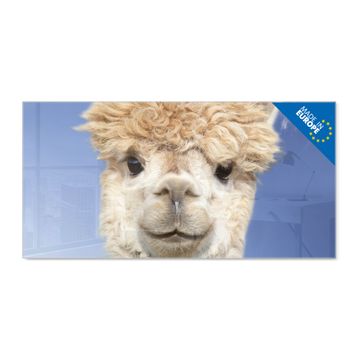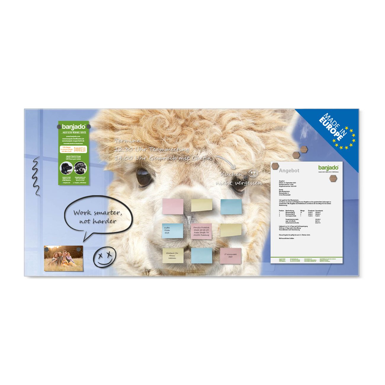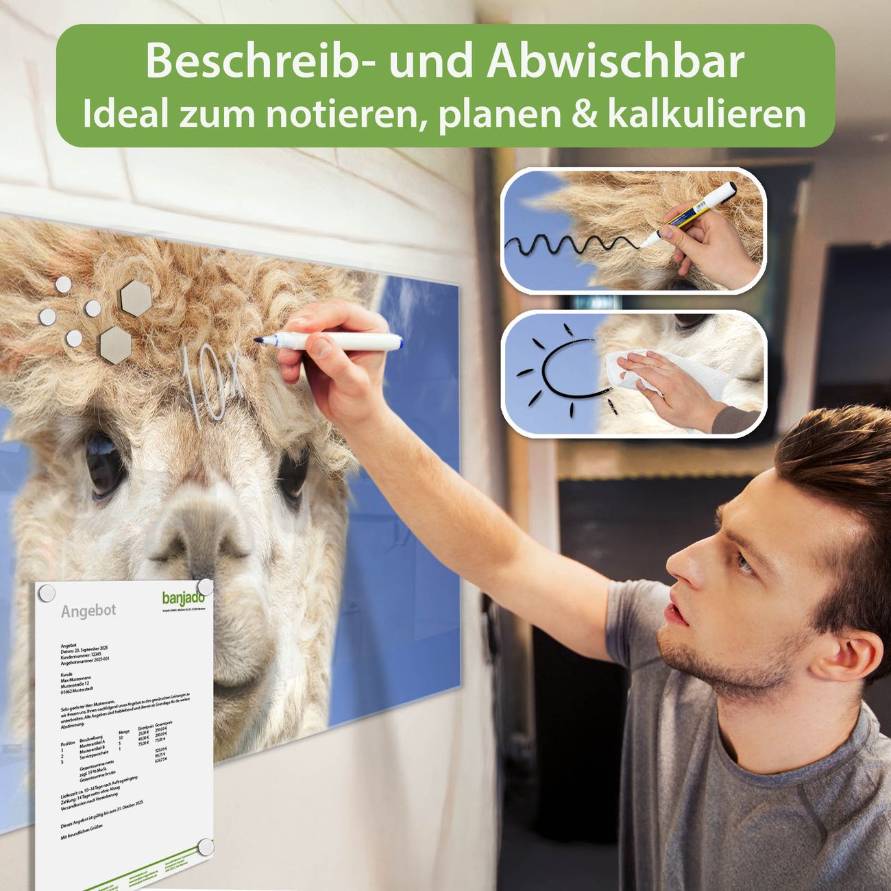 Material: 4mm Sicherheitsglas mit Metallrückwand Eigenschaften: beschreibbar, magnetisch, kratzfest Maße: 120x60x0,6cm, 10,80kg schwer Motiv Nummer 10017 Lama Zubehör: inklusive 4 Neodym-Magnete