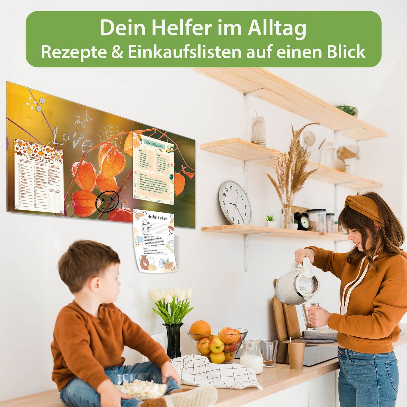 Ein Stück Design, das Ihren Alltag organisiert. Schreiben, heften, inspirieren - alles an einem Ort. Qualität, die man spürt. Montage leicht gemacht. Handwerk mit Herz - veredelt in Sachsen. Einzigartiges Design mit Motiv Motiv Lampionblume Beschreibbare Glasoberfläche, leicht zu reinigen Starke Magnetkraft durch Stahlrückwand Inklusive 4 Neodym-Magneten Flexible Montageoptionen Handveredelt in Sachsen - Qualität, die bleibt