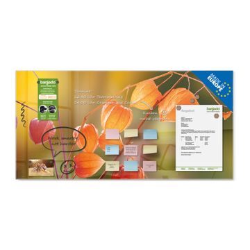 Material: 4mm Sicherheitsglas mit Metallrückwand Eigenschaften: beschreibbar, magnetisch, kratzfest Maße: 100x50x0,6cm, 7,50kg schwer Motiv Nummer 10322 Lampionblume Zubehör: inklusive 4 Neodym-Magnete