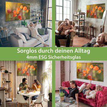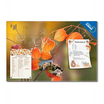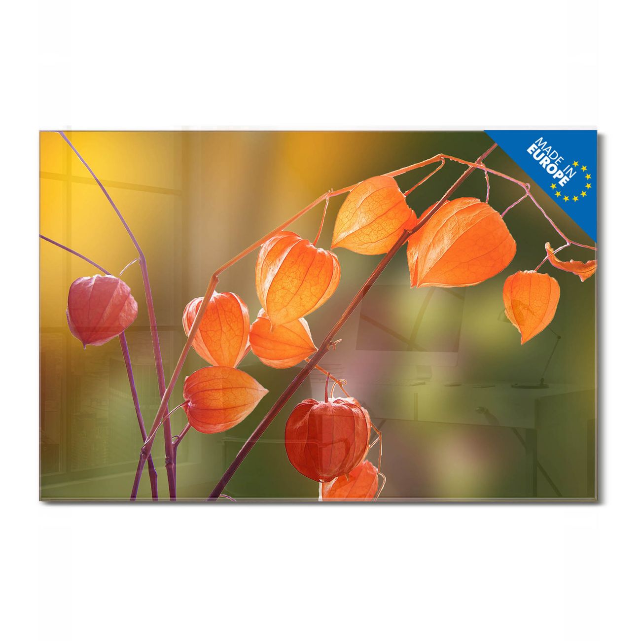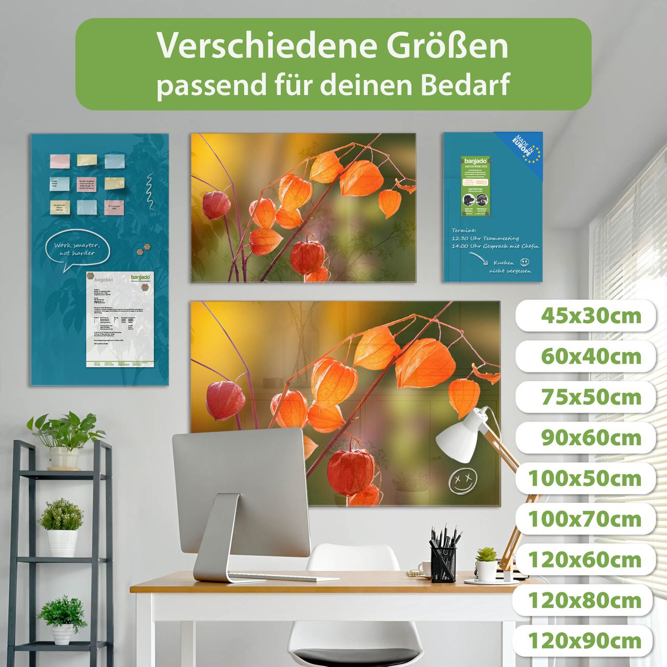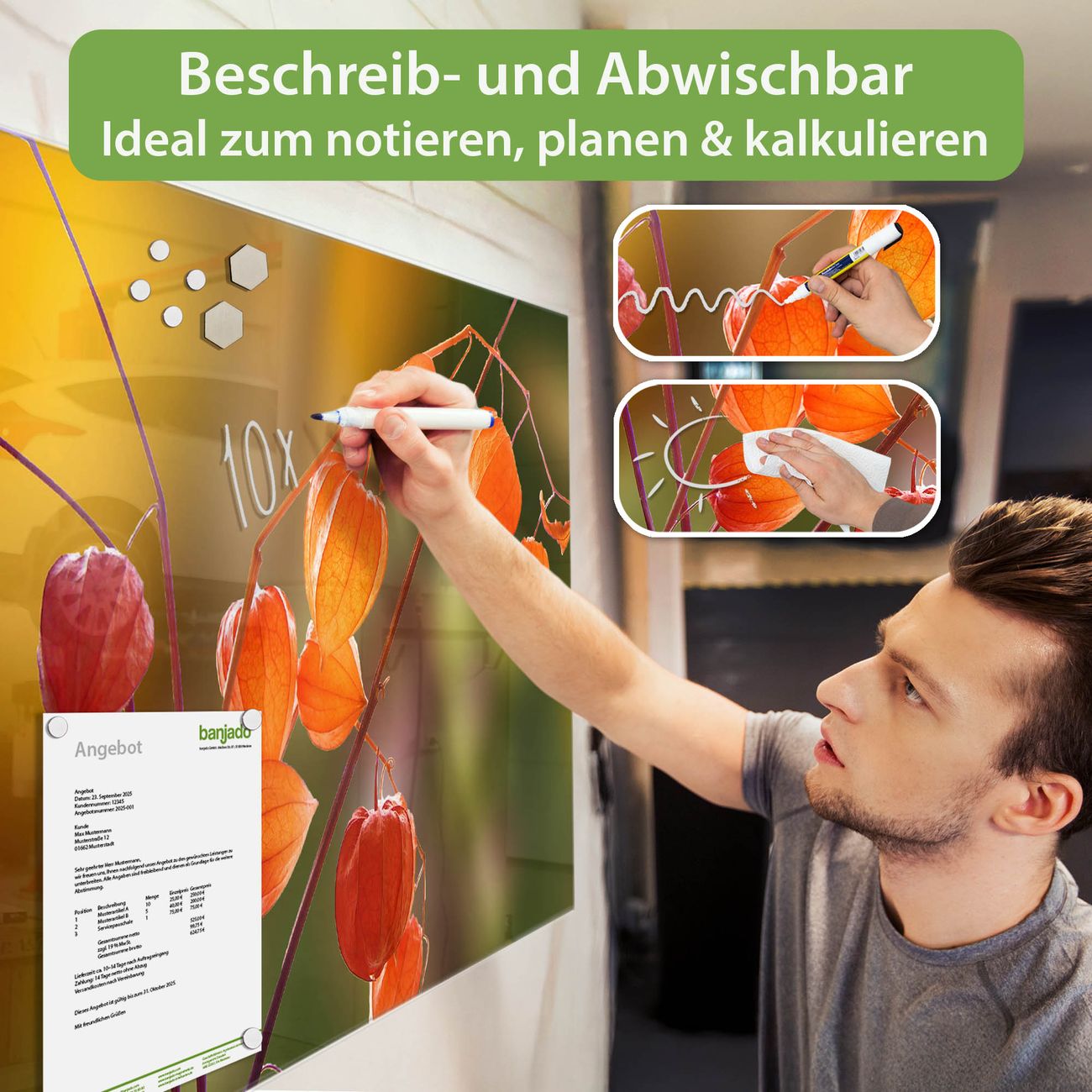 Material: 4mm Sicherheitsglas mit Metallrückwand Eigenschaften: beschreibbar, magnetisch, kratzfest Maße: 75x50x0,6cm, 5,63kg schwer Motiv Nummer 10322 Lampionblume Zubehör: inklusive 4 Neodym-Magnete