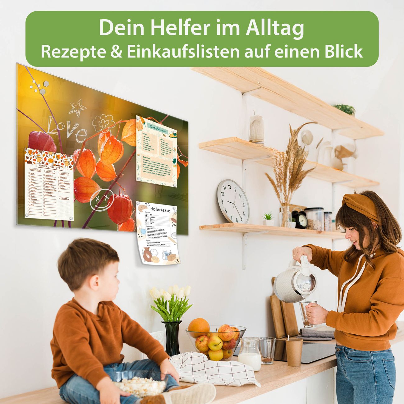 Ein Stück Design, das Ihren Alltag organisiert. Schreiben, heften, inspirieren - alles an einem Ort. Qualität, die man spürt. Montage leicht gemacht. Handwerk mit Herz - veredelt in Sachsen. Einzigartiges Design mit Motiv Motiv Lampionblume Beschreibbare Glasoberfläche, leicht zu reinigen Starke Magnetkraft durch Stahlrückwand Inklusive 4 Neodym-Magneten Flexible Montageoptionen Handveredelt in Sachsen - Qualität, die bleibt