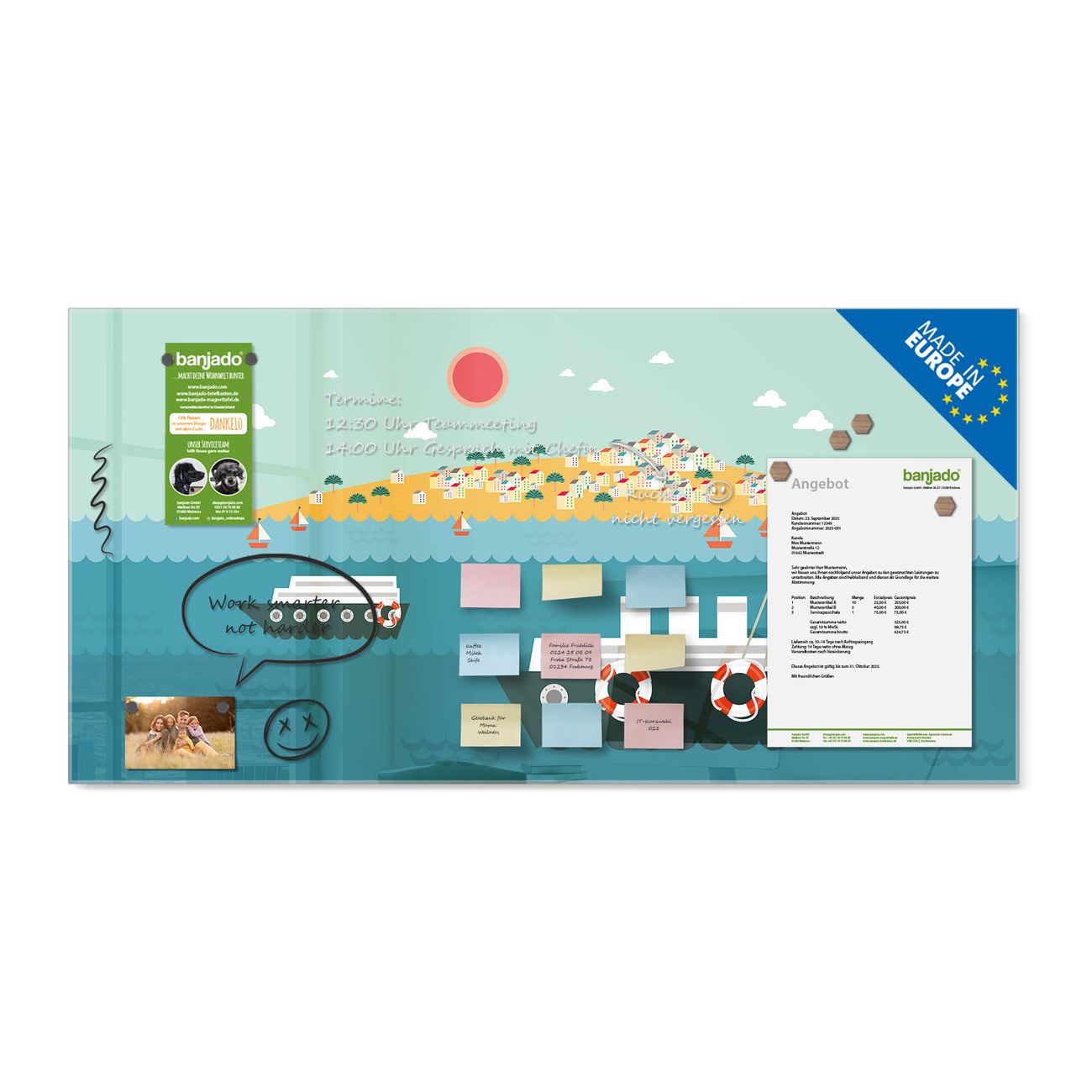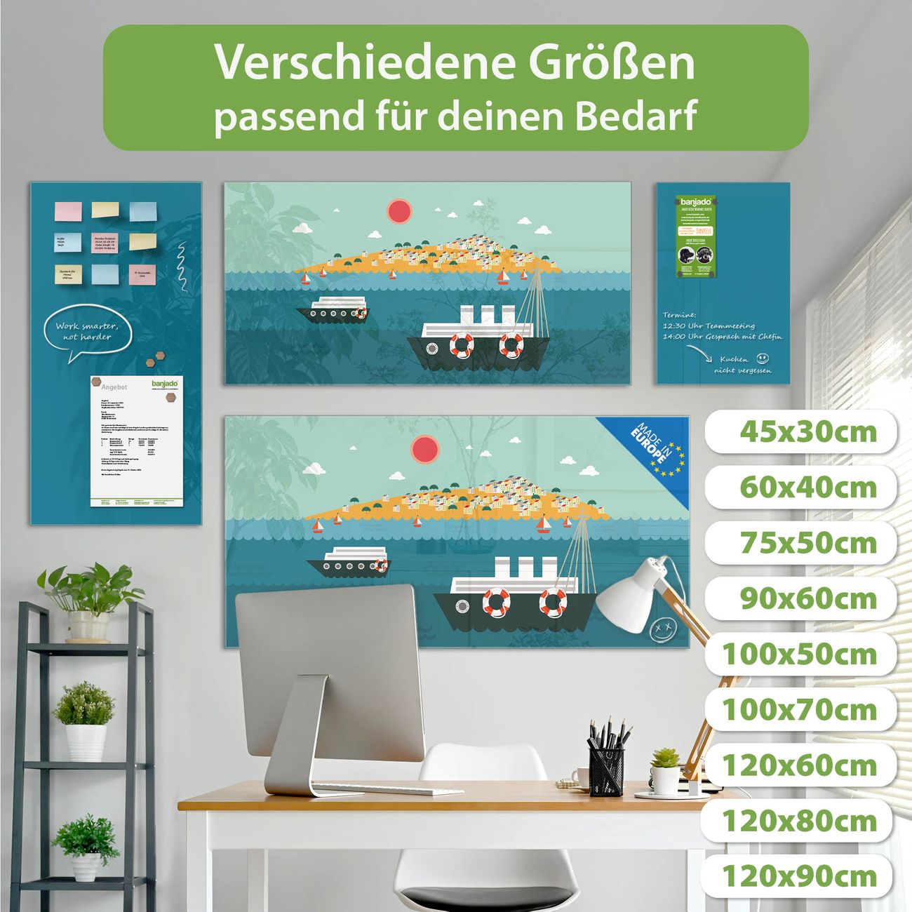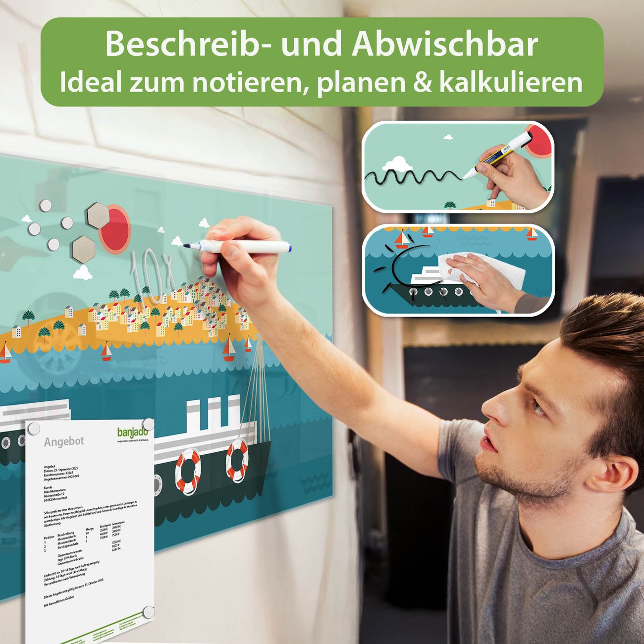 Jede Glas Magnettafel wird in unserer Werkstatt von Hand gefertigt und sorgfältig geprüft. So erhalten Sie ein echtes Qualitätsprodukt, das Funktion und Ästhetik perfekt vereint.?? Warum banjado?