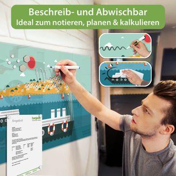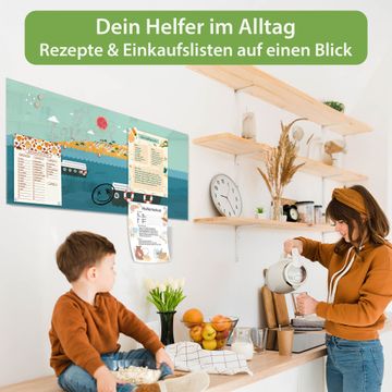 Material: 4mm Sicherheitsglas mit Metallrückwand Eigenschaften: beschreibbar, magnetisch, kratzfest Maße: 120x60x0,6cm, 10,80kg schwer Motiv Nummer 11921 Land in Sicht Zubehör: inklusive 4 Neodym-Magnete