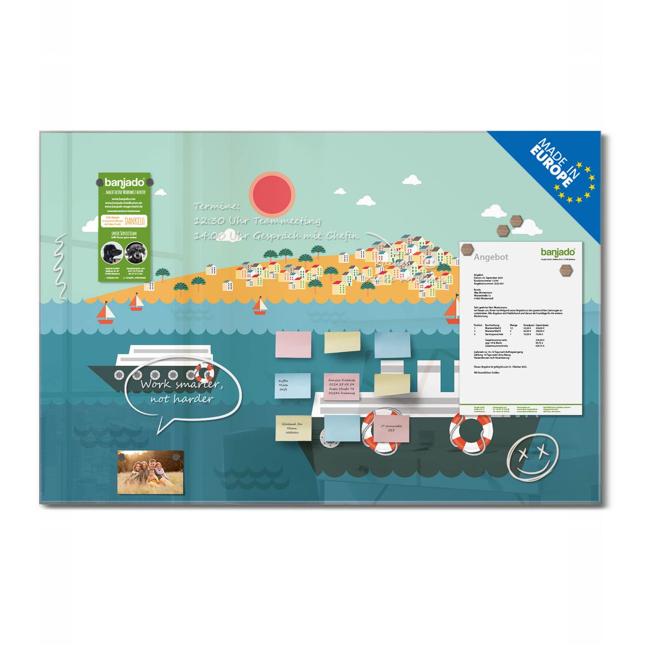 Material: 4mm Sicherheitsglas mit Metallrückwand Eigenschaften: beschreibbar, magnetisch, kratzfest Maße: 120x80x0,6cm, 14,40kg schwer Motiv Nummer 11921 Land in Sicht Zubehör: inklusive 4 Neodym-Magnete