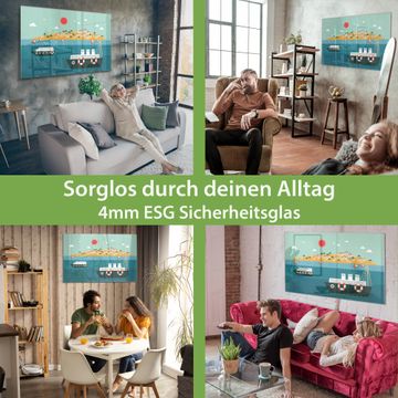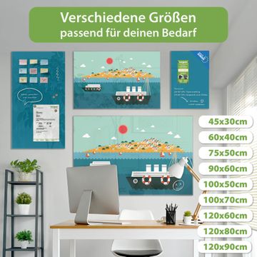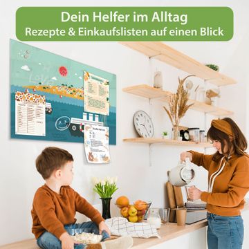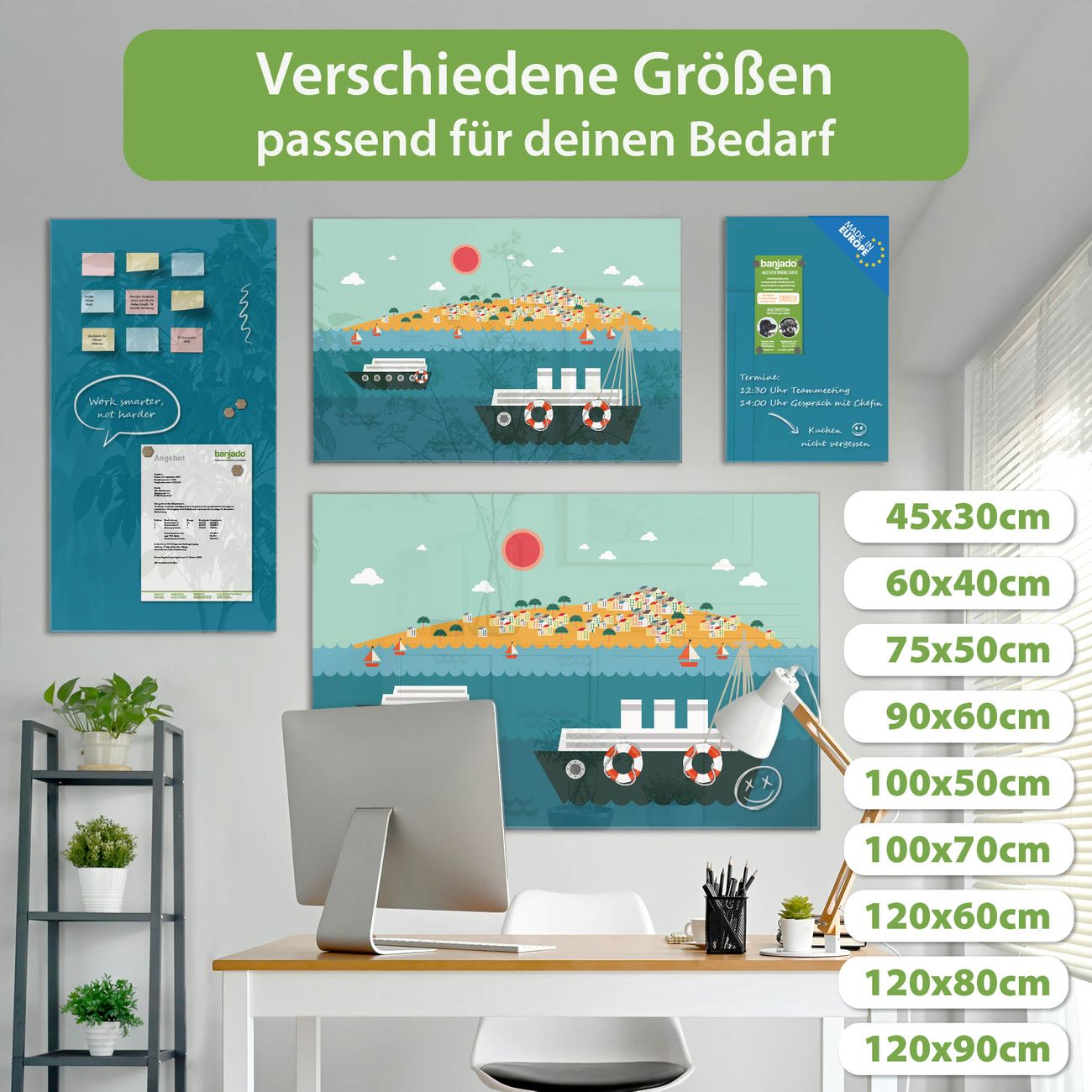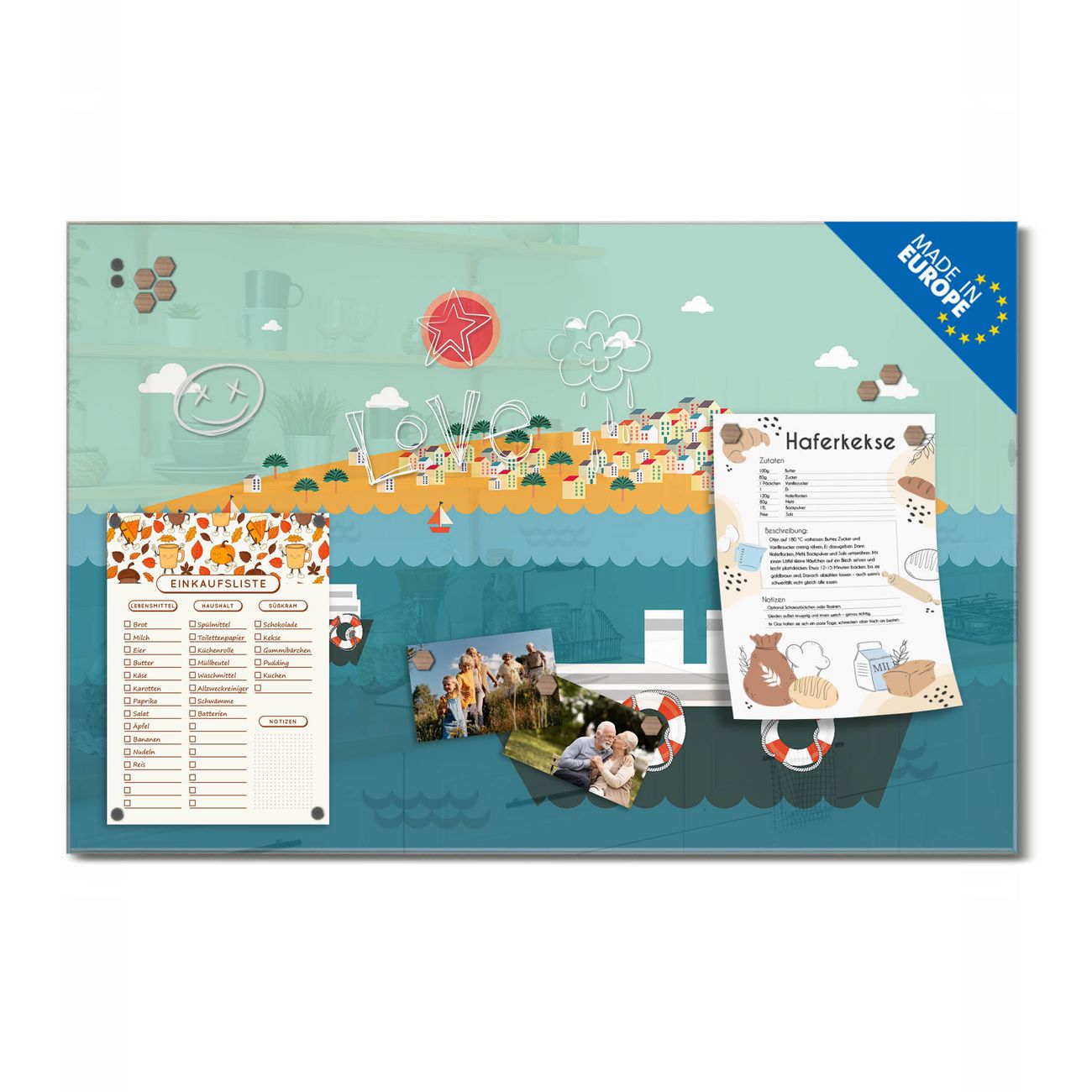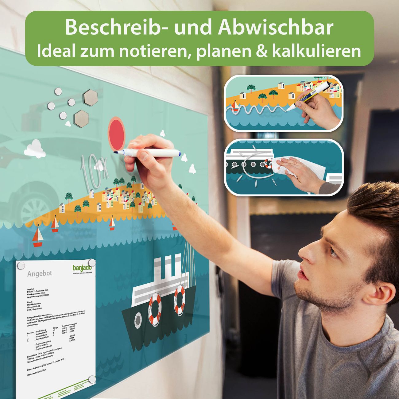 Material: 4mm Sicherheitsglas mit Metallrückwand Eigenschaften: beschreibbar, magnetisch, kratzfest Maße: 45x30x0,6cm, 2,03kg schwer Motiv Nummer 11921 Land in Sicht Zubehör: inklusive 4 Neodym-Magnete
