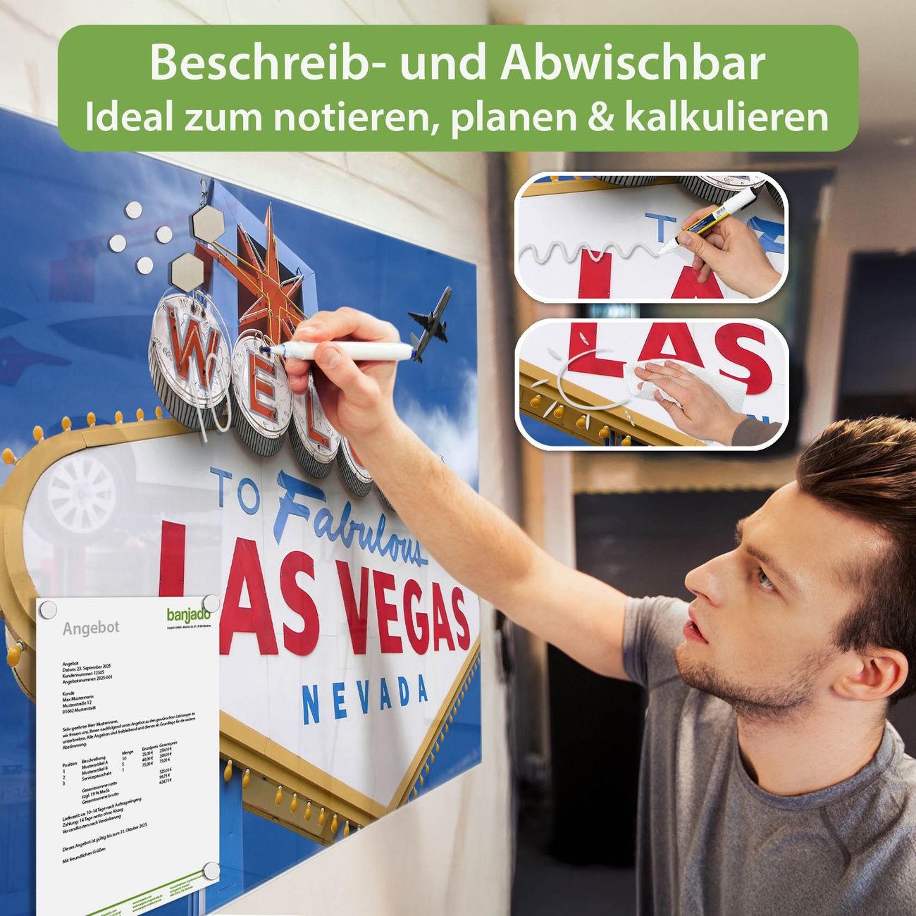 Material: 4mm Sicherheitsglas mit Metallrückwand Eigenschaften: beschreibbar, magnetisch, kratzfest Maße: 120x80x0,6cm, 14,40kg schwer Motiv Nummer 10127 Las Vegas Zubehör: inklusive 4 Neodym-Magnete