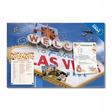 Material: 4mm Sicherheitsglas mit Metallrückwand Eigenschaften: beschreibbar, magnetisch, kratzfest Maße: 75x50x0,6cm, 5,63kg schwer Motiv Nummer 10127 Las Vegas Zubehör: inklusive 4 Neodym-Magnete