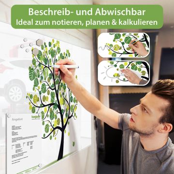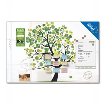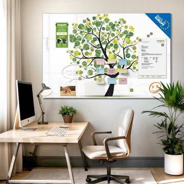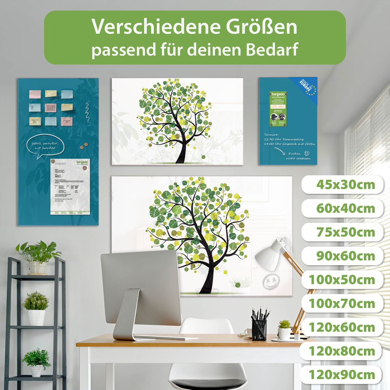 Material: 4mm Sicherheitsglas mit Metallrückwand Eigenschaften: beschreibbar, magnetisch, kratzfest Maße: 90x60x0,6cm, 8,10kg schwer Motiv Nummer 10347 Laubzauberbaum Zubehör: inklusive 4 Neodym-Magnete