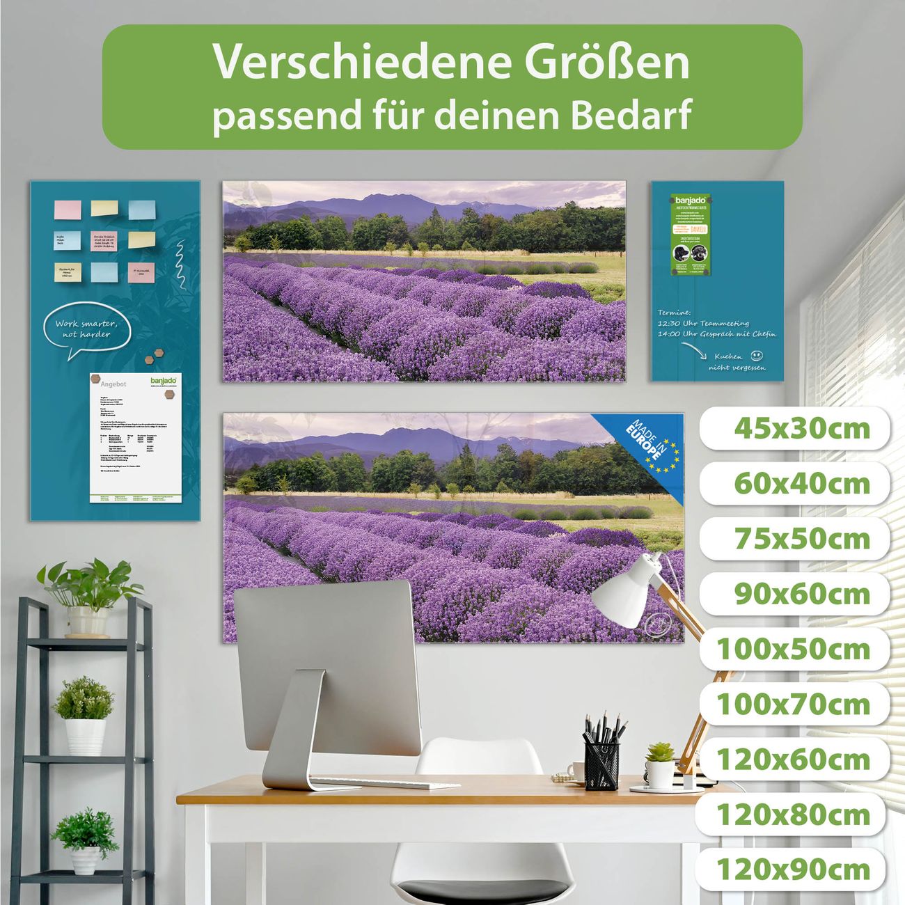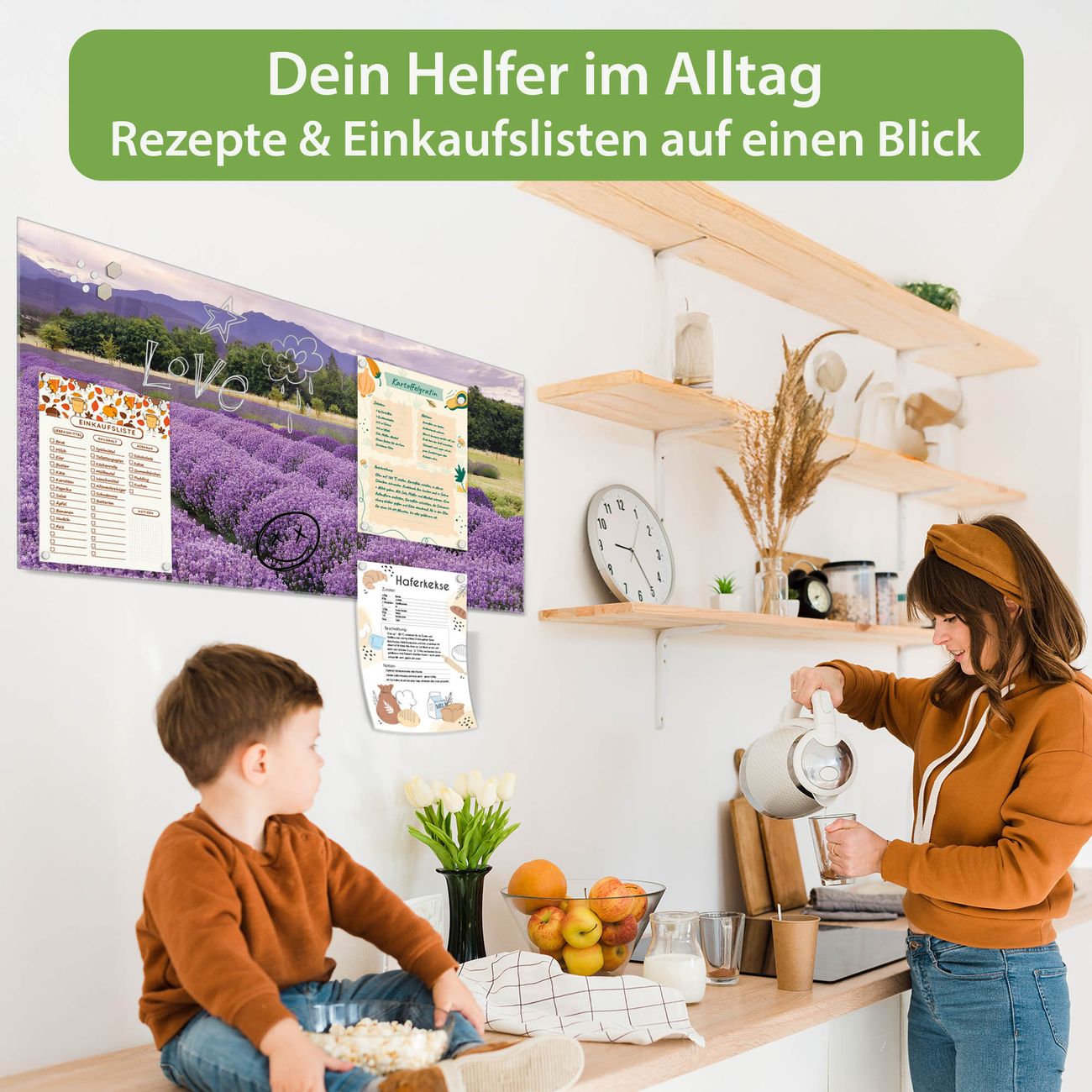 Material: 4mm Sicherheitsglas mit Metallrückwand Eigenschaften: beschreibbar, magnetisch, kratzfest Maße: 100x50x0,6cm, 7,50kg schwer Motiv Nummer 10429 Lavendel 1 Zubehör: inklusive 4 Neodym-Magnete