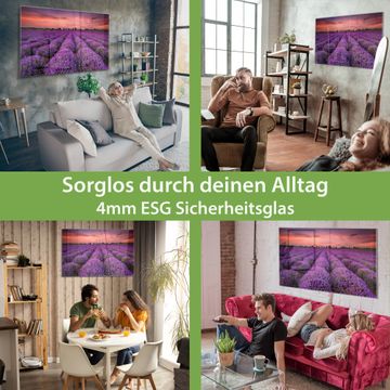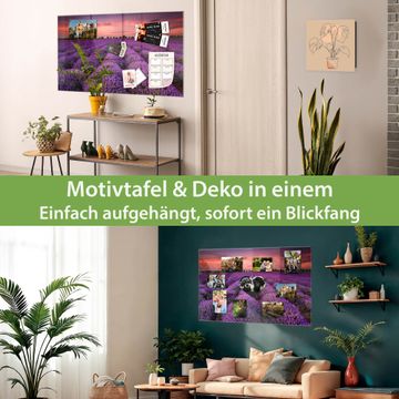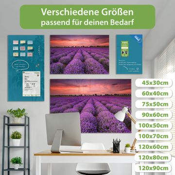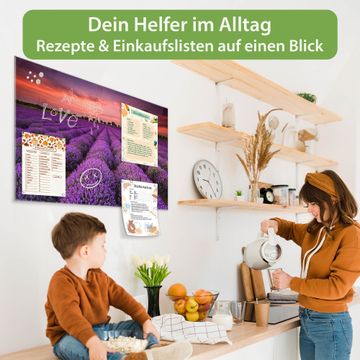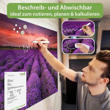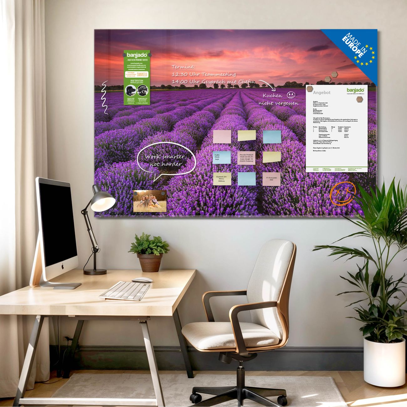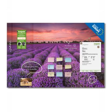 Material: 4mm Sicherheitsglas mit Metallrückwand Eigenschaften: beschreibbar, magnetisch, kratzfest Maße: 90x60x0,6cm, 8,10kg schwer Motiv Nummer 12678 Lavendelfeld Zubehör: inklusive 4 Neodym-Magnete