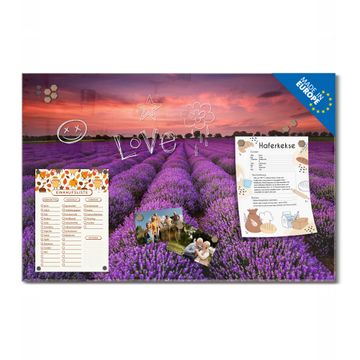 Material: 4mm Sicherheitsglas mit Metallrückwand Eigenschaften: beschreibbar, magnetisch, kratzfest Maße: 45x30x0,6cm, 2,03kg schwer Motiv Nummer 12678 Lavendelfeld Zubehör: inklusive 4 Neodym-Magnete
