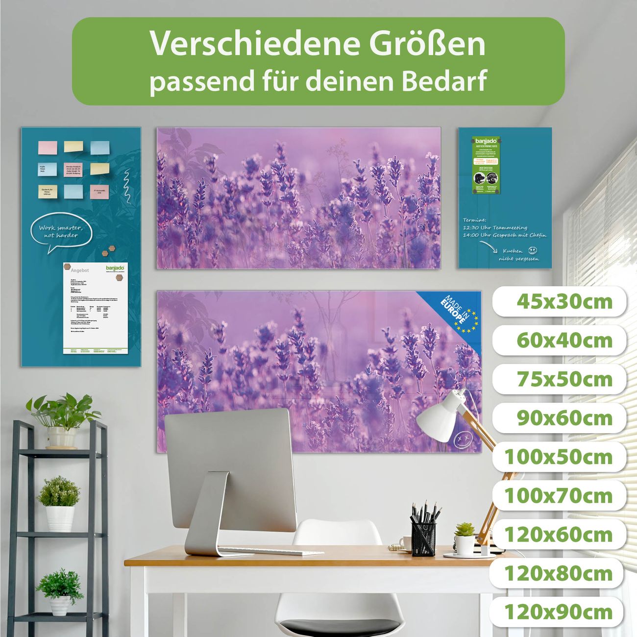Material: 4mm Sicherheitsglas mit Metallrückwand Eigenschaften: beschreibbar, magnetisch, kratzfest Maße: 100x50x0,6cm, 7,50kg schwer Motiv Nummer 11483 Lavendelmeer Zubehör: inklusive 4 Neodym-Magnete