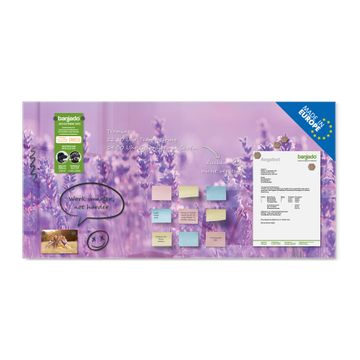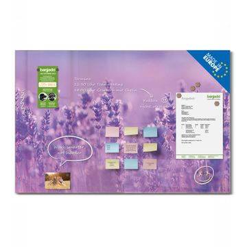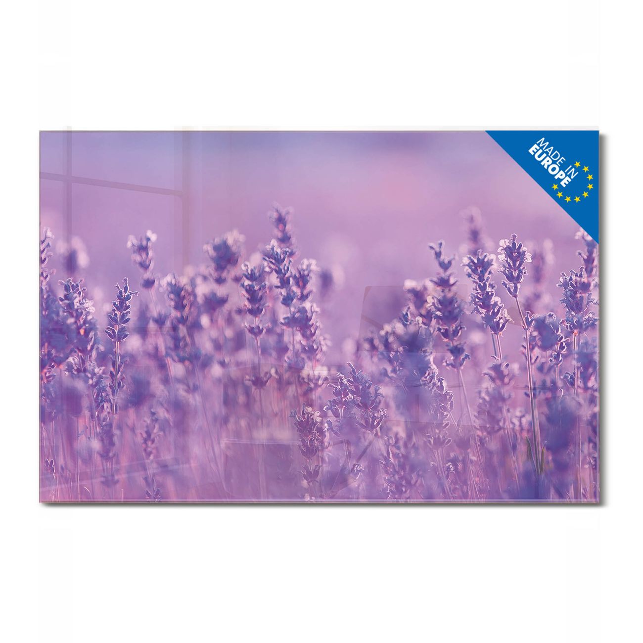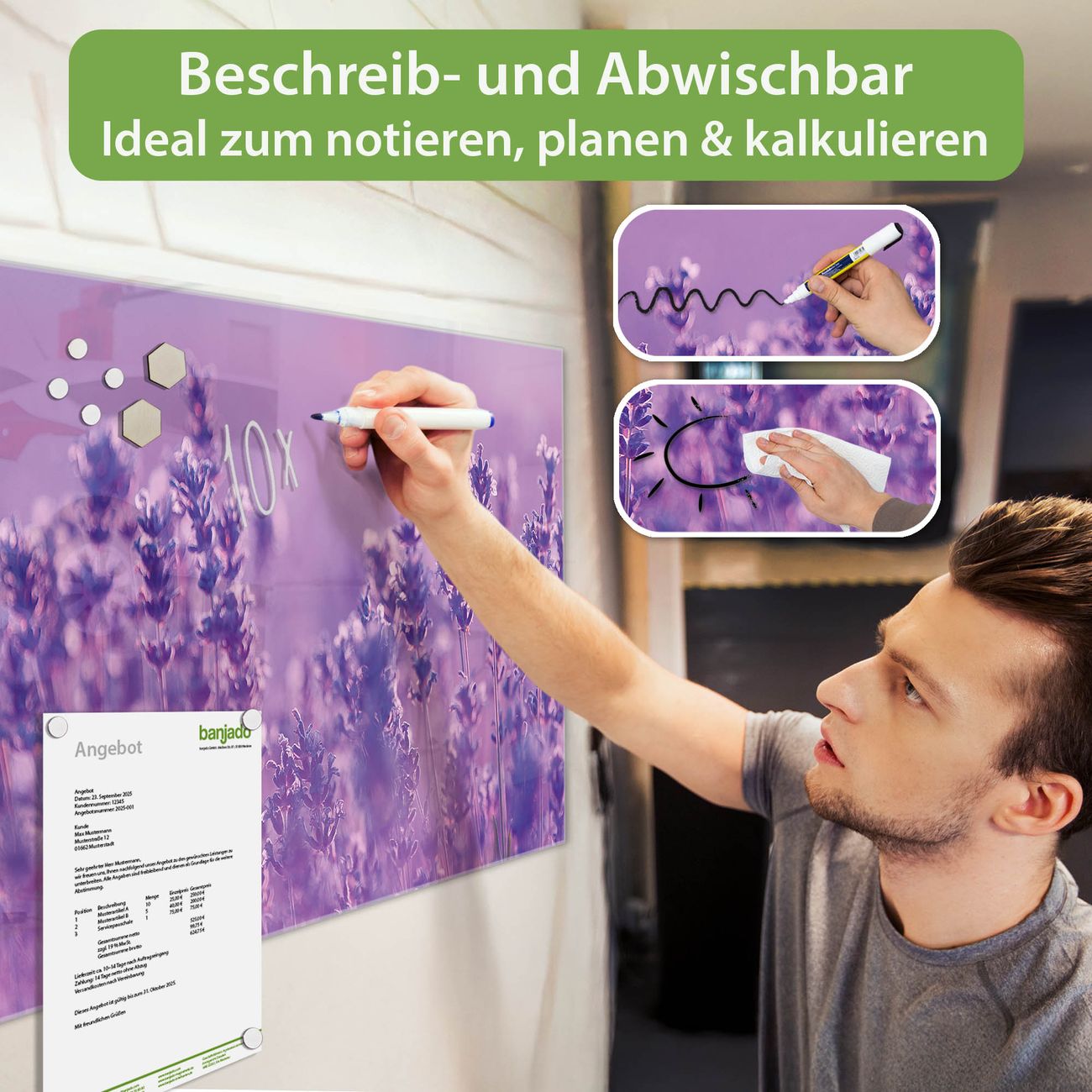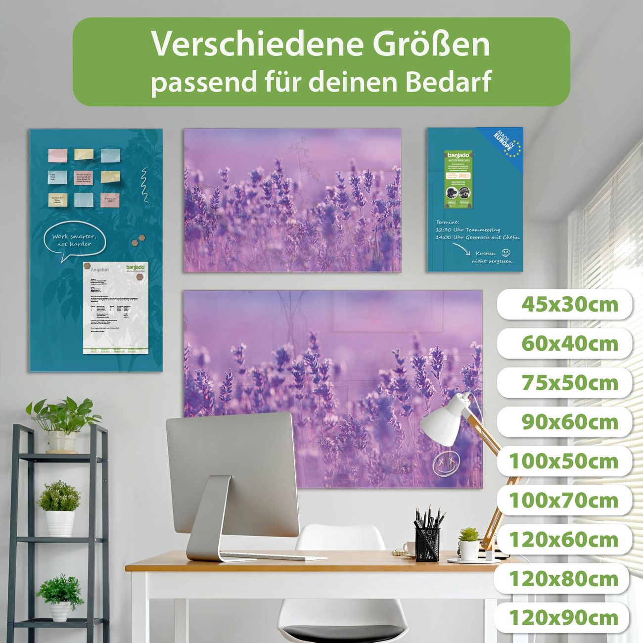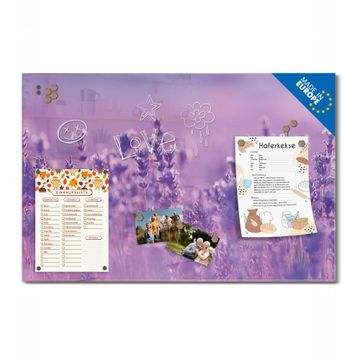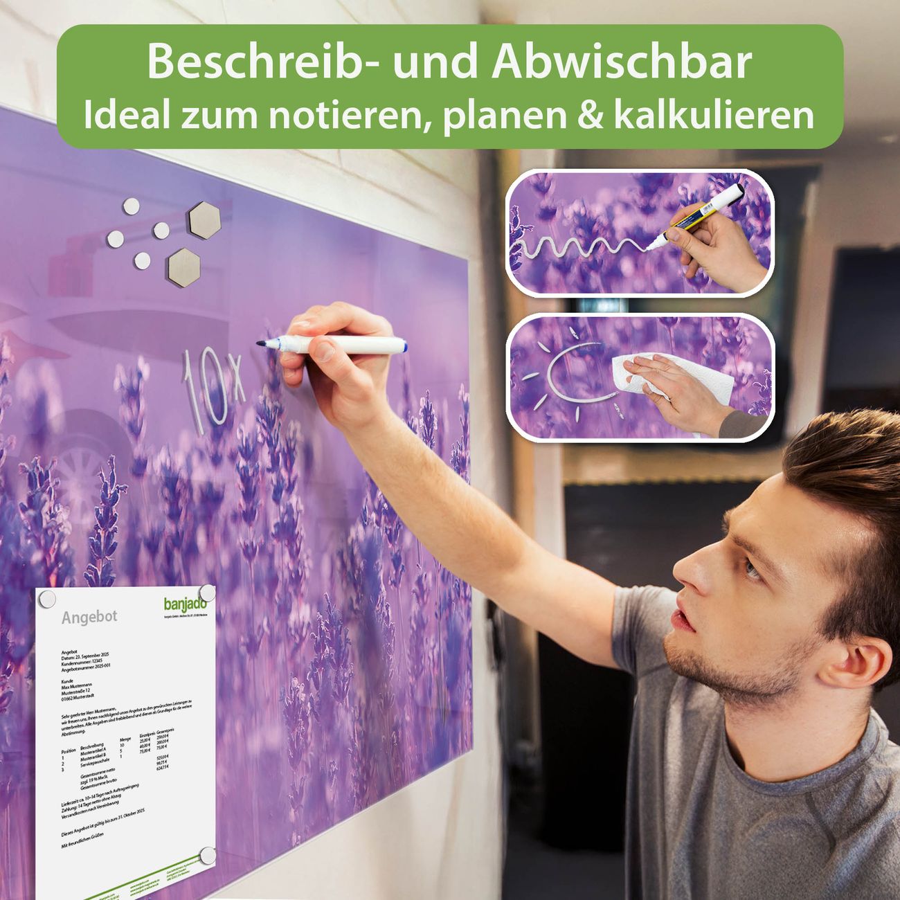 Material: 4mm Sicherheitsglas mit Metallrückwand Eigenschaften: beschreibbar, magnetisch, kratzfest Maße: 120x60x0,6cm, 10,80kg schwer Motiv Nummer 11483 Lavendelmeer Zubehör: inklusive 4 Neodym-Magnete