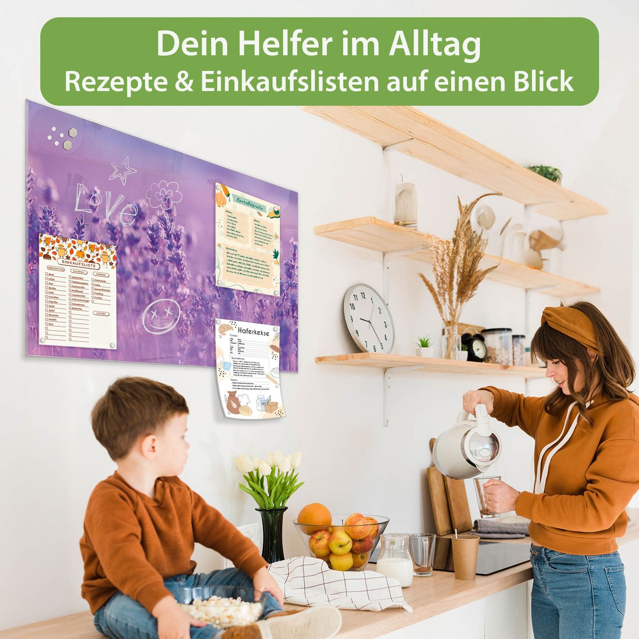 Ein Stück Design, das Ihren Alltag organisiert. Schreiben, heften, inspirieren - alles an einem Ort. Qualität, die man spürt. Montage leicht gemacht. Handwerk mit Herz - veredelt in Sachsen. Einzigartiges Design mit Motiv Motiv Lavendelmeer Beschreibbare Glasoberfläche, leicht zu reinigen Starke Magnetkraft durch Stahlrückwand Inklusive 4 Neodym-Magneten Flexible Montageoptionen Handveredelt in Sachsen - Qualität, die bleibt