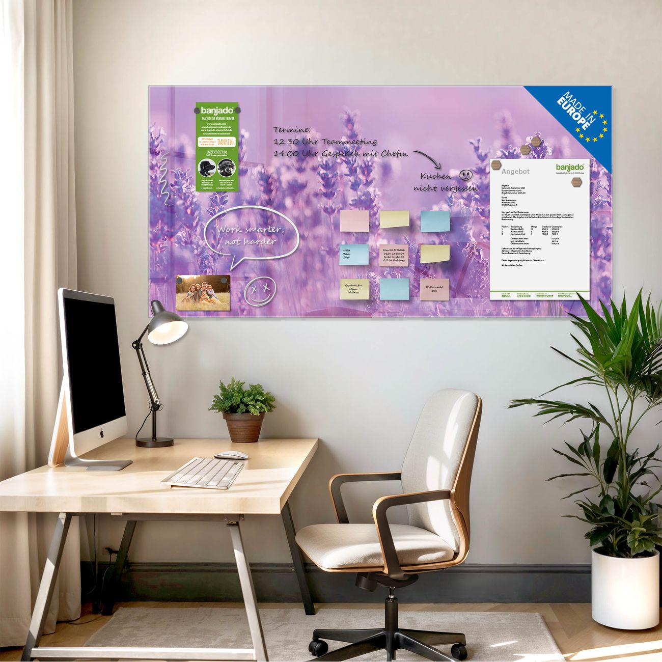 Die banjado Glas Magnettafel mit dem Motiv Motiv Lavendelmeer verbindet Funktionalität mit Stil. Sie ersetzt das Zettelchaos durch klare Strukturen und bringt dabei eine warme, natürliche Atmosphäre in Ihr Zuhause. Ob im Büro, in der Küche oder im Eingangsbereich - dieses Design-Board zieht Blicke an und sorgt für Ordnung mit Charakter.