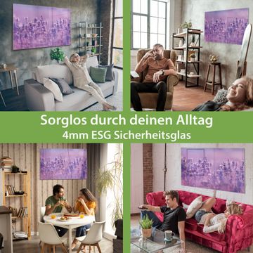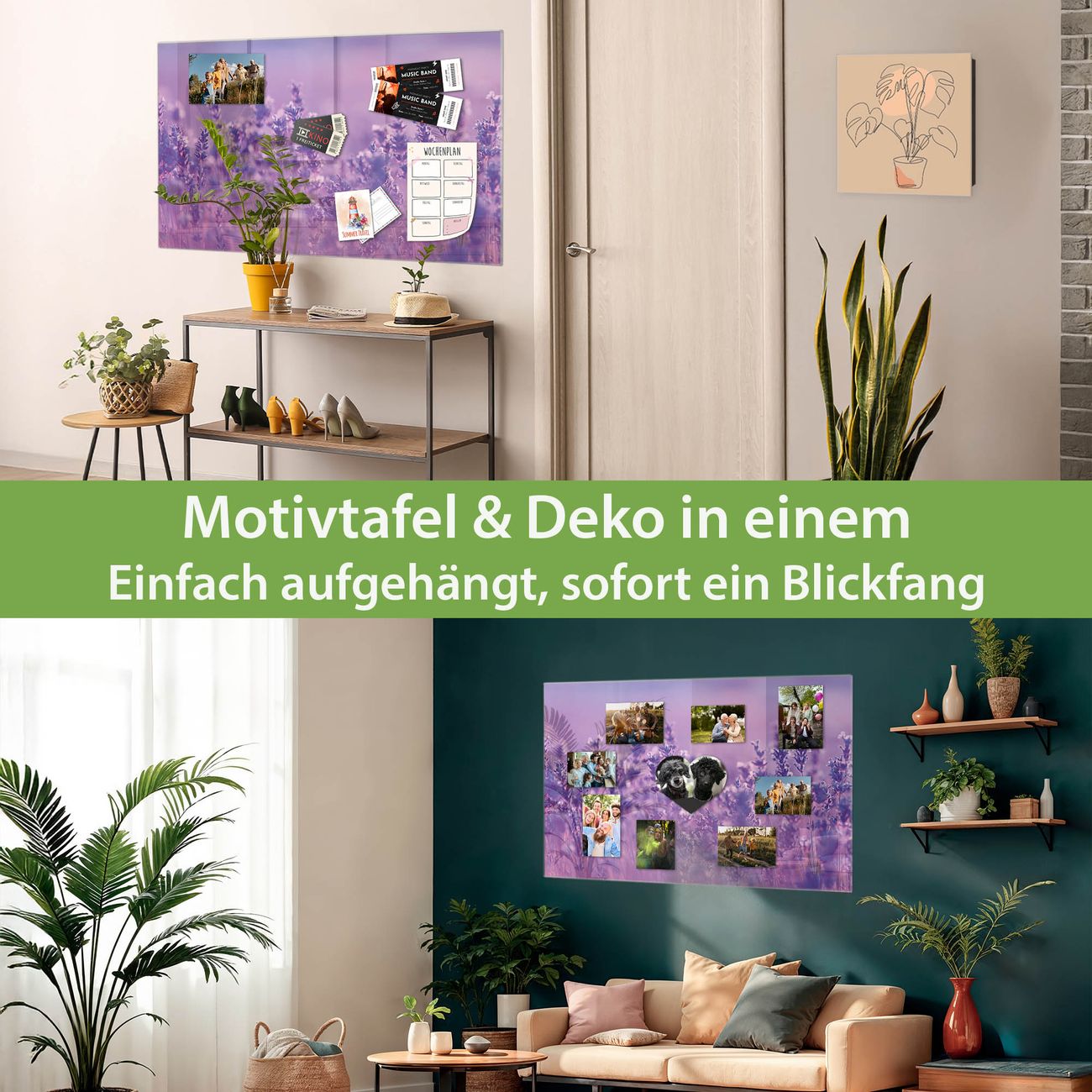 Material: 4mm Sicherheitsglas mit Metallrückwand Eigenschaften: beschreibbar, magnetisch, kratzfest Maße: 45x30x0,6cm, 2,03kg schwer Motiv Nummer 11483 Lavendelmeer Zubehör: inklusive 4 Neodym-Magnete
