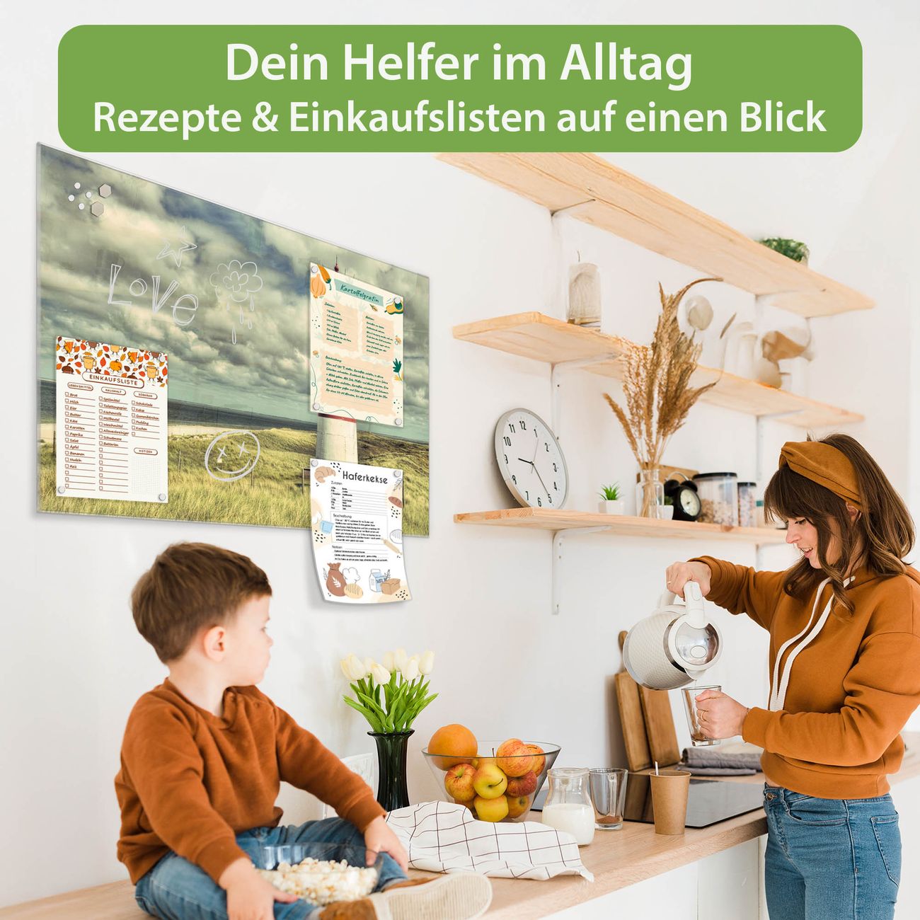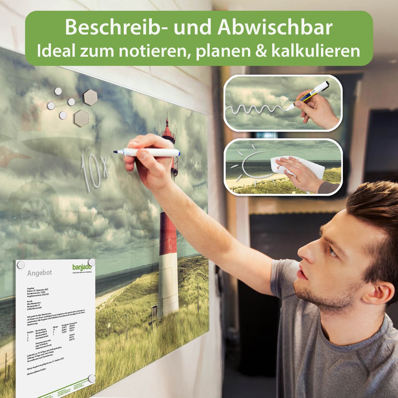 Auf der glatten Glasoberfläche lassen sich Termine, Rezepte oder Notizen ganz einfach mit Kreidestiften festhalten und rückstandslos entfernen. Starke Neodym-Magnete halten Ihre wichtigsten Erinnerungen sicher an Ort und Stelle. So entsteht Ihre ganz persönliche Ideenwand - jeden Tag neu.