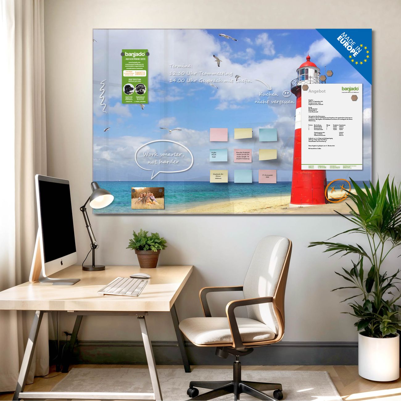 Die banjado Glas Magnettafel mit dem Motiv Motiv Leuchtturm Westkapelle verbindet Funktionalität mit Stil. Sie ersetzt das Zettelchaos durch klare Strukturen und bringt dabei eine warme, natürliche Atmosphäre in Ihr Zuhause. Ob im Büro, in der Küche oder im Eingangsbereich - dieses Design-Board zieht Blicke an und sorgt für Ordnung mit Charakter.
