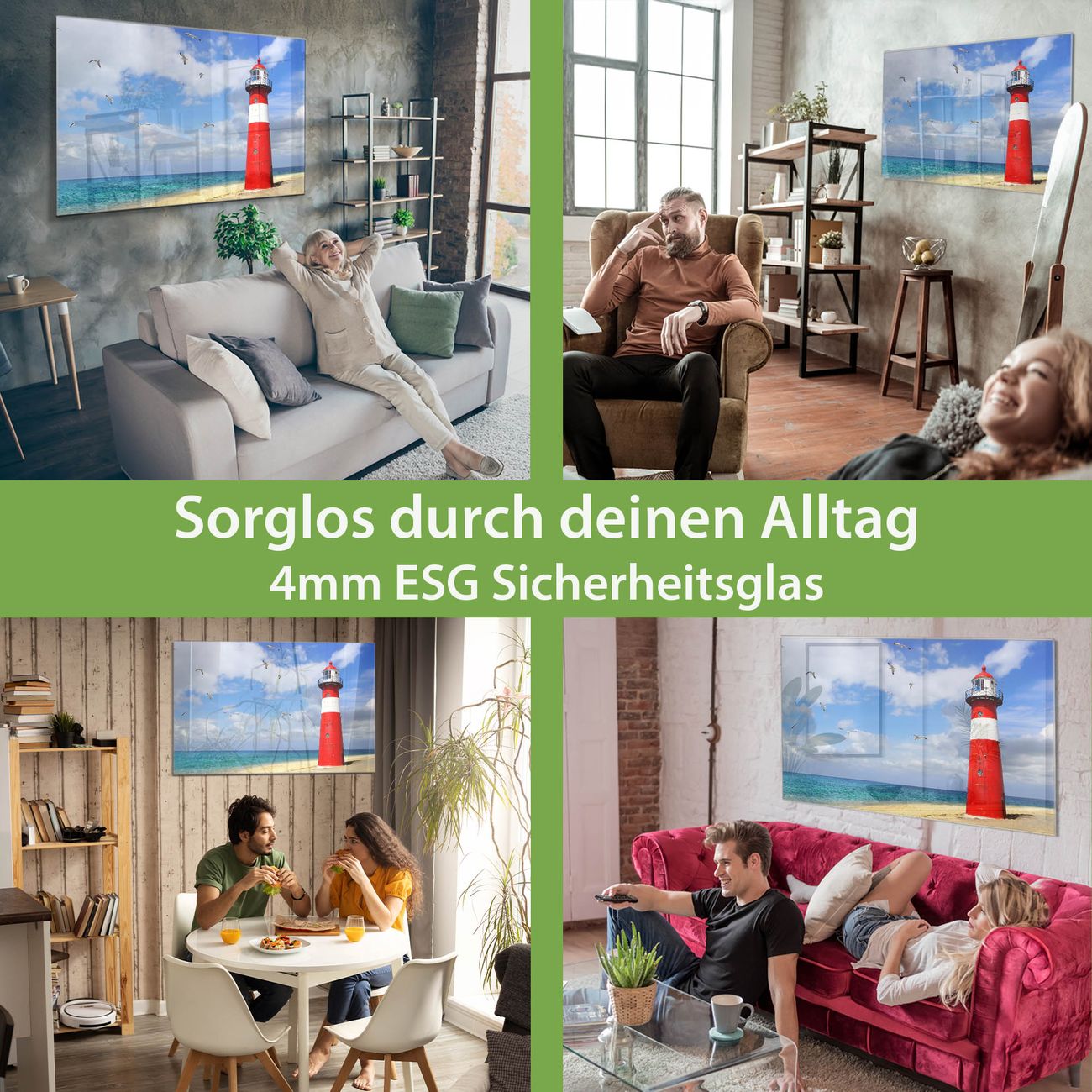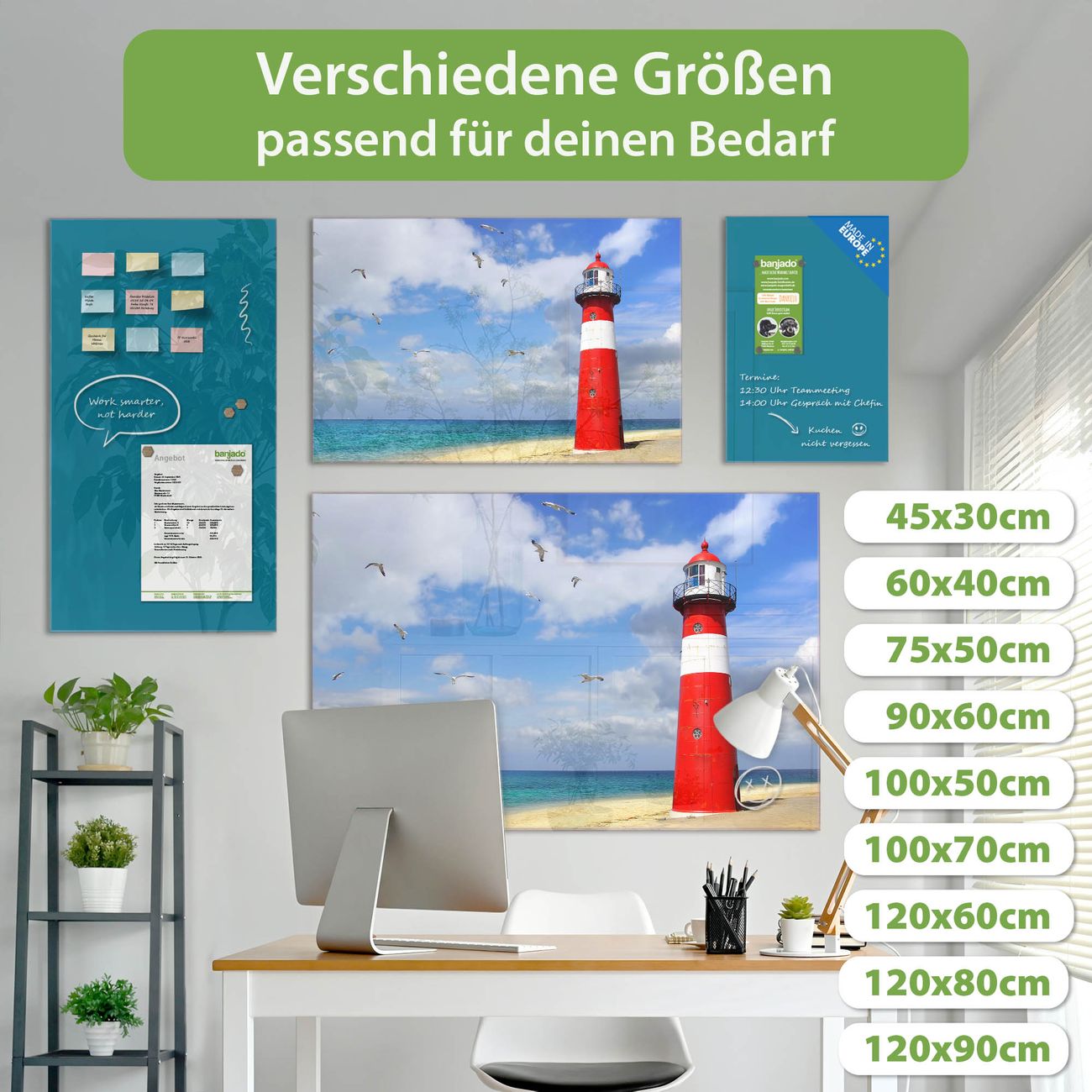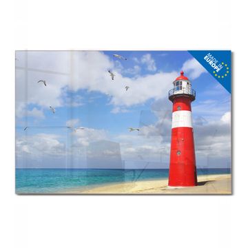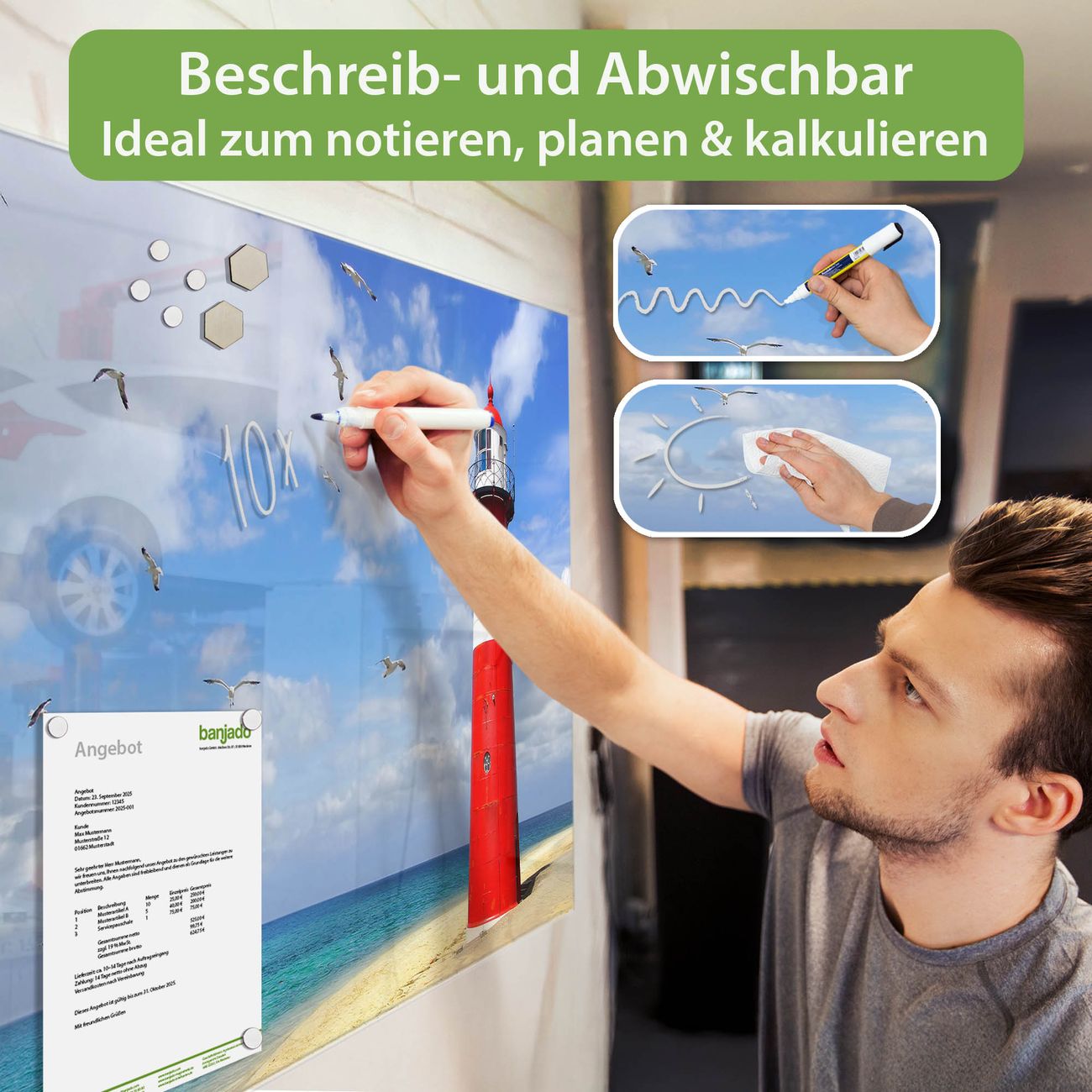 Material: 4mm Sicherheitsglas mit Metallrückwand Eigenschaften: beschreibbar, magnetisch, kratzfest Maße: 90x60x0,6cm, 8,10kg schwer Motiv Nummer 11244 Leuchtturm Westkapelle Zubehör: inklusive 4 Neodym-Magnete