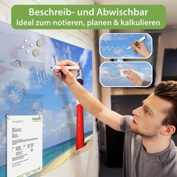 Auf der glatten Glasoberfläche lassen sich Termine, Rezepte oder Notizen ganz einfach mit Kreidestiften festhalten und rückstandslos entfernen. Starke Neodym-Magnete halten Ihre wichtigsten Erinnerungen sicher an Ort und Stelle. So entsteht Ihre ganz persönliche Ideenwand - jeden Tag neu.