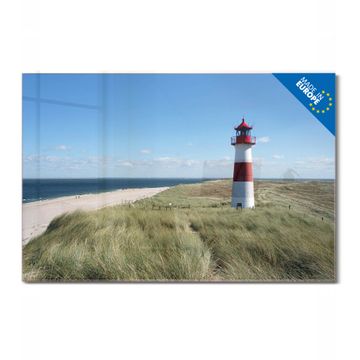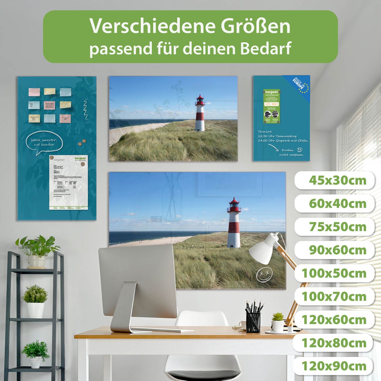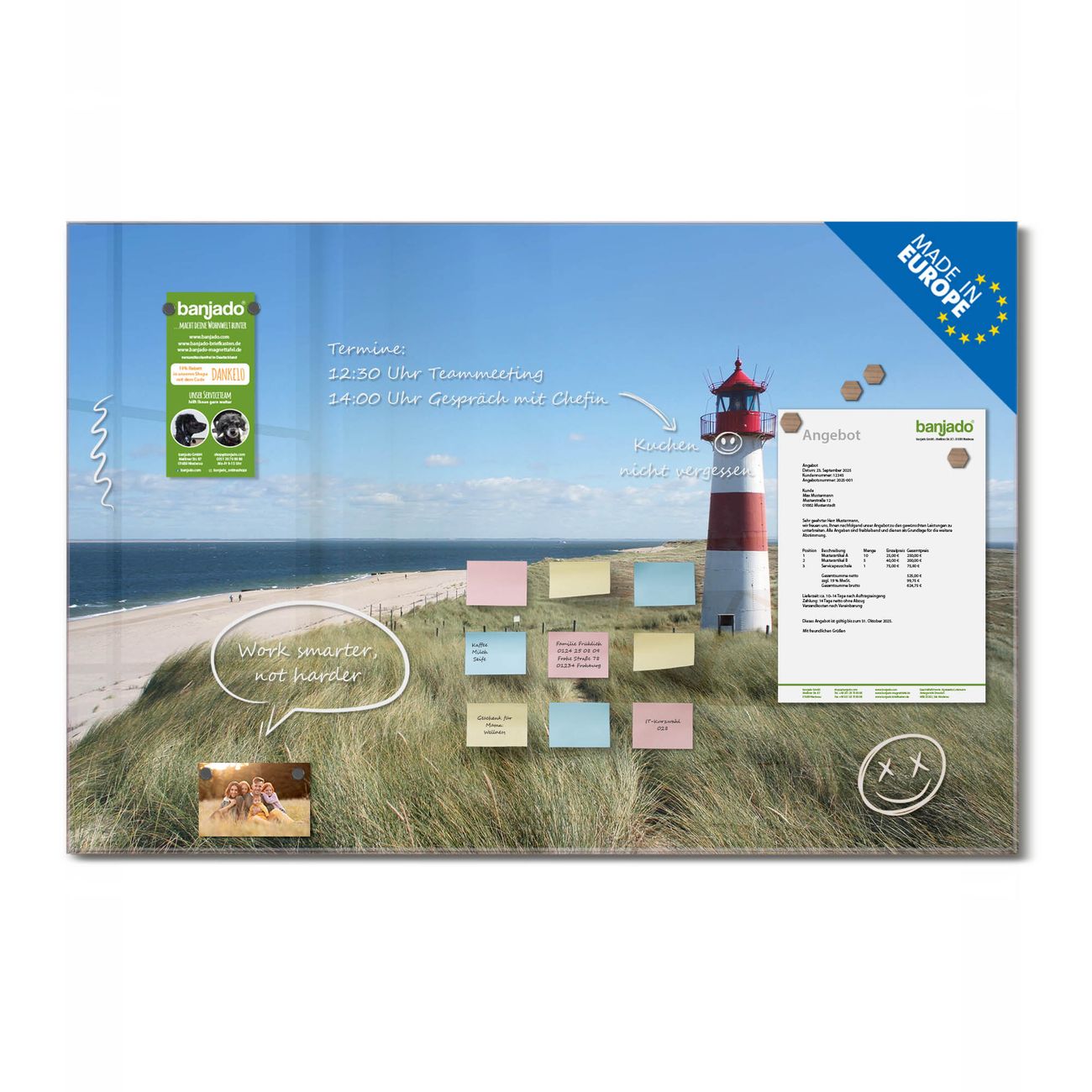 Material: 4mm Sicherheitsglas mit Metallrückwand Eigenschaften: beschreibbar, magnetisch, kratzfest Maße: 120x80x0,6cm, 14,40kg schwer Motiv Nummer 10082 Leuchtturm Zubehör: inklusive 4 Neodym-Magnete