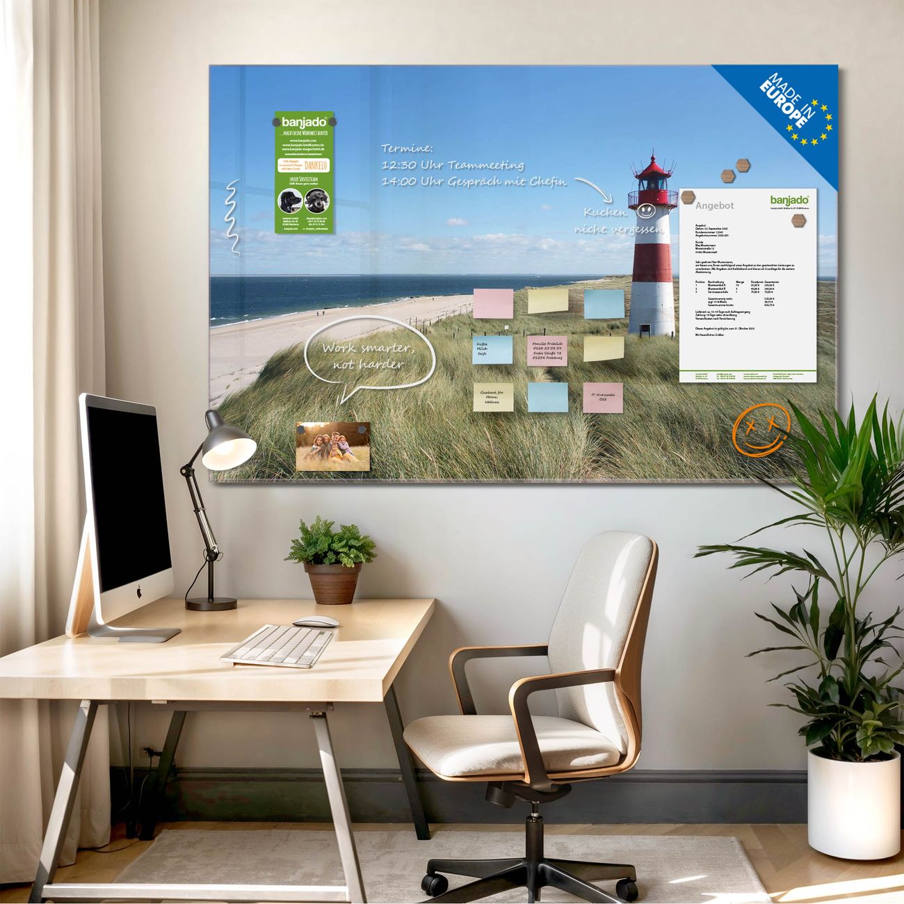 Die banjado Glas Magnettafel mit dem Motiv Motiv Leuchtturm verbindet Funktionalität mit Stil. Sie ersetzt das Zettelchaos durch klare Strukturen und bringt dabei eine warme, natürliche Atmosphäre in Ihr Zuhause. Ob im Büro, in der Küche oder im Eingangsbereich - dieses Design-Board zieht Blicke an und sorgt für Ordnung mit Charakter.