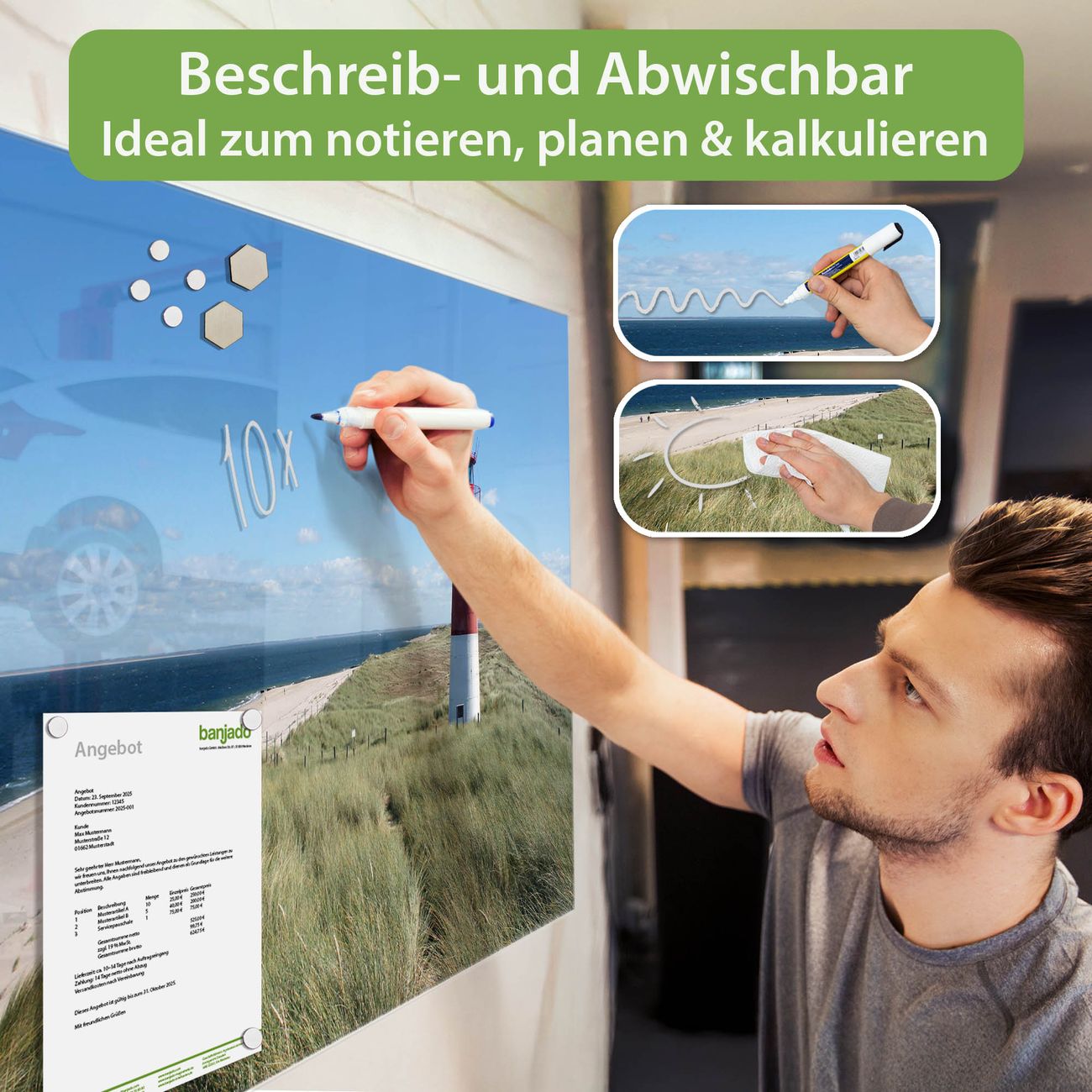 Jede Glas Magnettafel wird in unserer Werkstatt von Hand gefertigt und sorgfältig geprüft. So erhalten Sie ein echtes Qualitätsprodukt, das Funktion und Ästhetik perfekt vereint.?? Warum banjado?