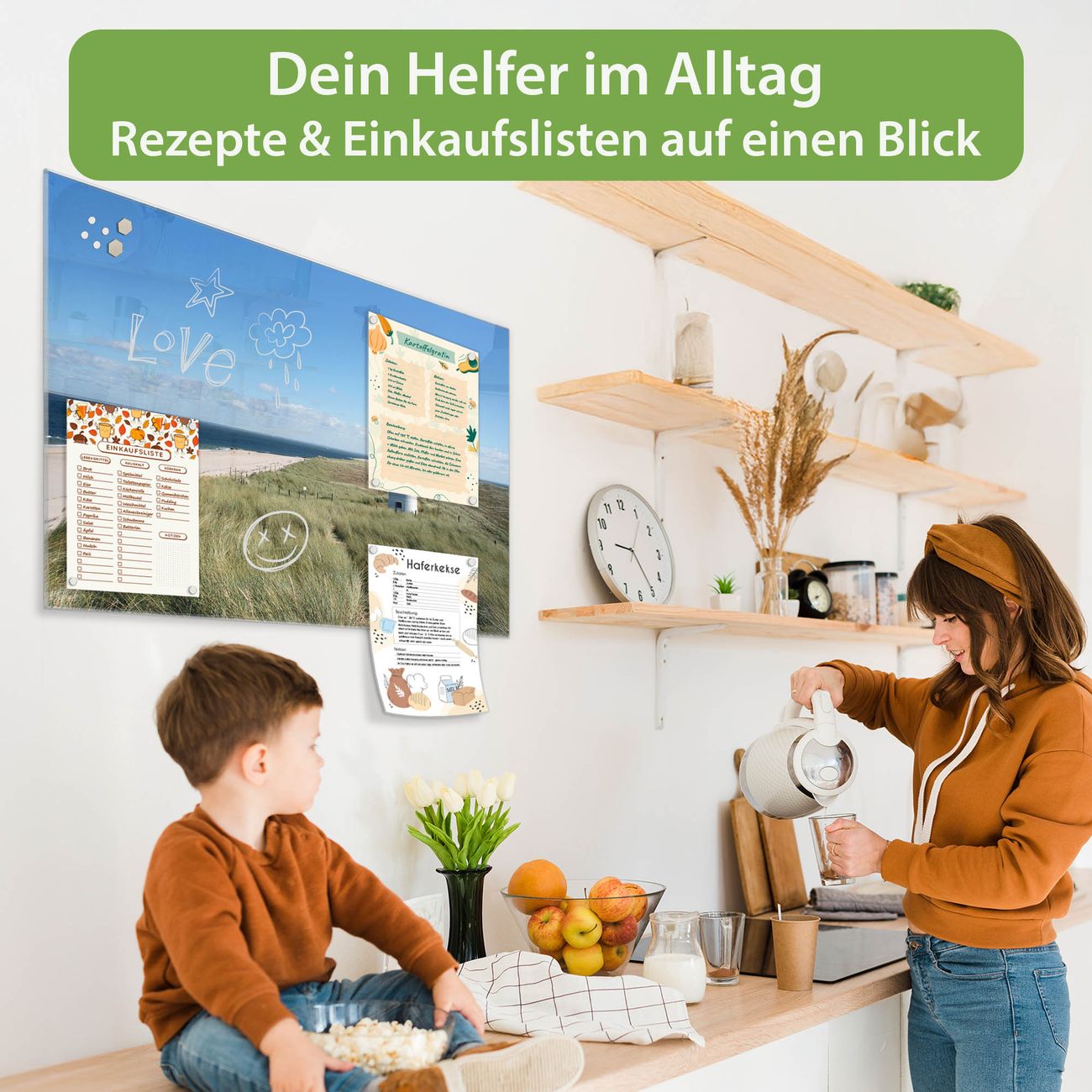 Auf der glatten Glasoberfläche lassen sich Termine, Rezepte oder Notizen ganz einfach mit Kreidestiften festhalten und rückstandslos entfernen. Starke Neodym-Magnete halten Ihre wichtigsten Erinnerungen sicher an Ort und Stelle. So entsteht Ihre ganz persönliche Ideenwand - jeden Tag neu.