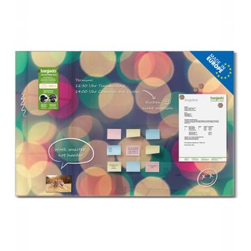 Material: 4mm Sicherheitsglas mit Metallrückwand Eigenschaften: beschreibbar, magnetisch, kratzfest Maße: 90x60x0,6cm, 8,10kg schwer Motiv Nummer 11676 Lichtpunkte Weiß Grün Rot Zubehör: inklusive 4 Neodym-Magnete