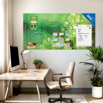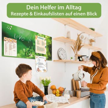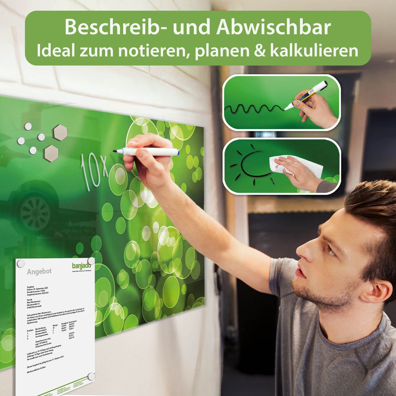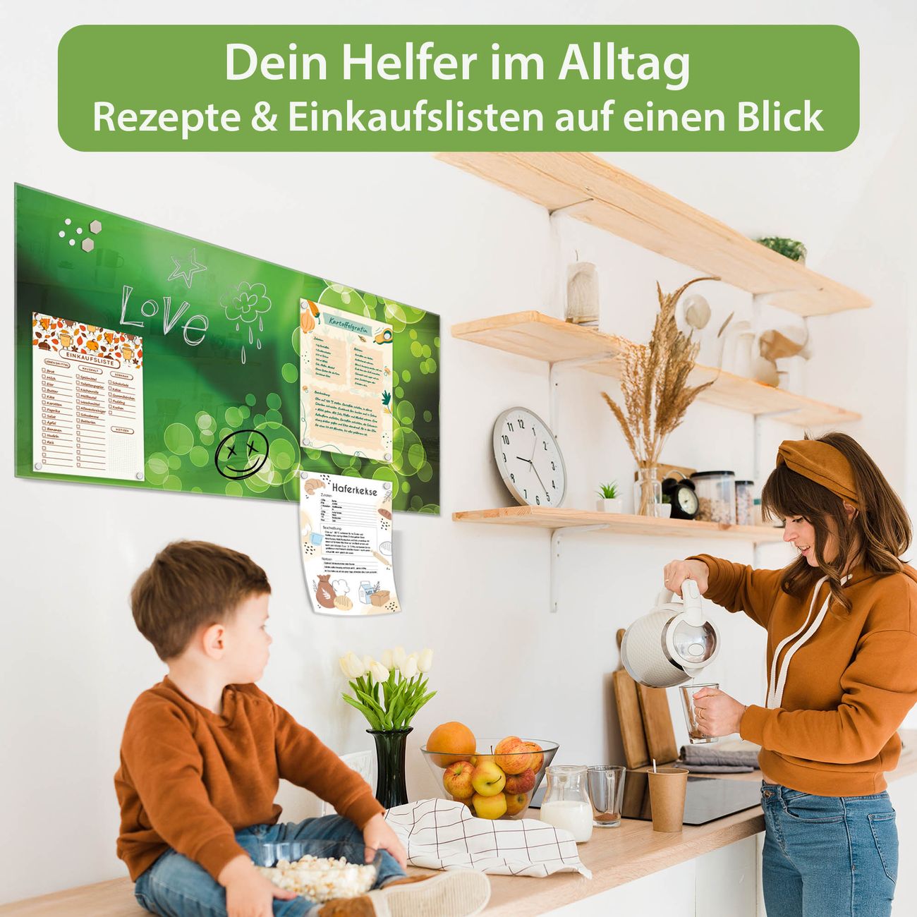 Auf der glatten Glasoberfläche lassen sich Termine, Rezepte oder Notizen ganz einfach mit Kreidestiften festhalten und rückstandslos entfernen. Starke Neodym-Magnete halten Ihre wichtigsten Erinnerungen sicher an Ort und Stelle. So entsteht Ihre ganz persönliche Ideenwand - jeden Tag neu.