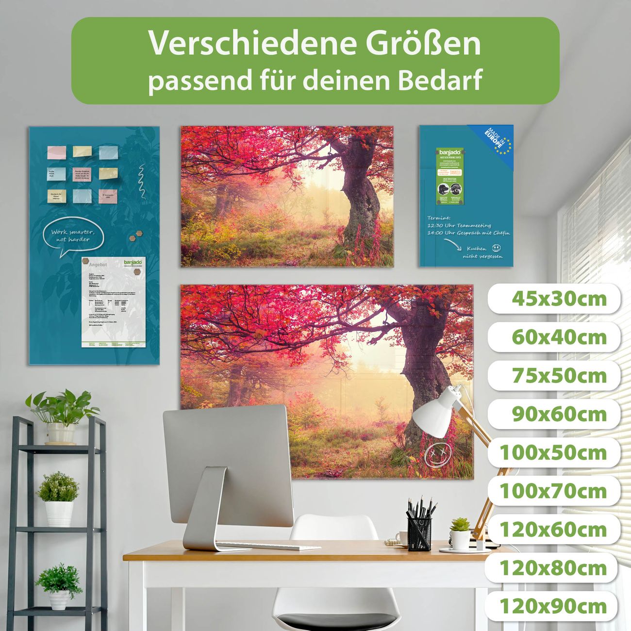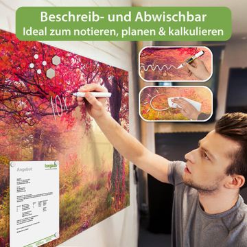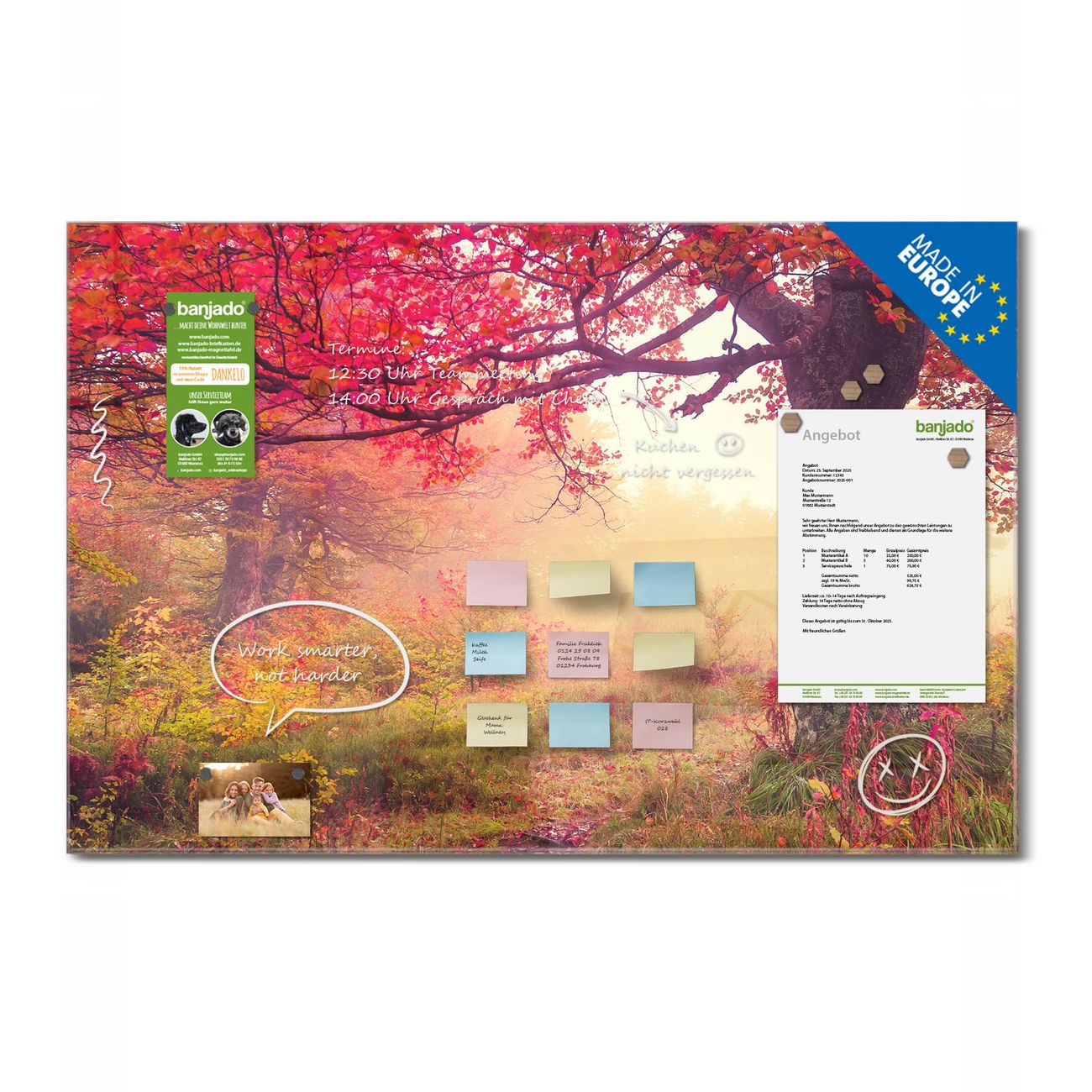 Material: 4mm Sicherheitsglas mit Metallrückwand Eigenschaften: beschreibbar, magnetisch, kratzfest Maße: 120x80x0,6cm, 14,40kg schwer Motiv Nummer 11177 Lichtung Im Herbst Zubehör: inklusive 4 Neodym-Magnete