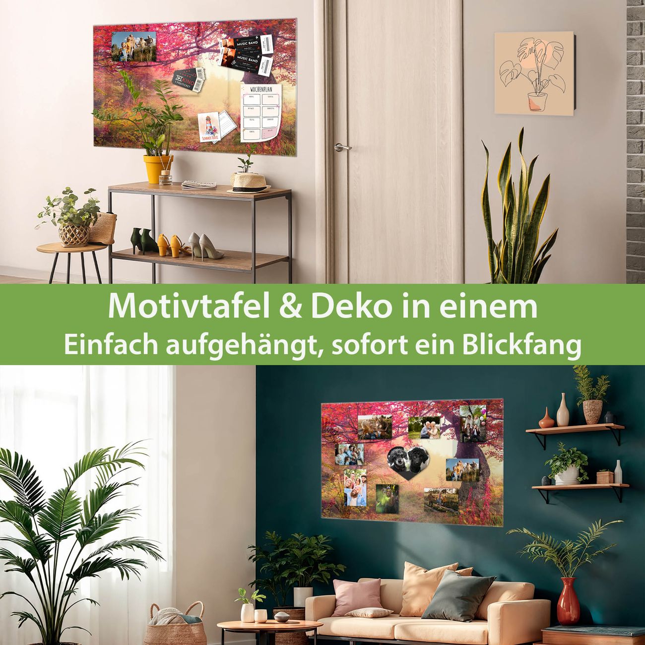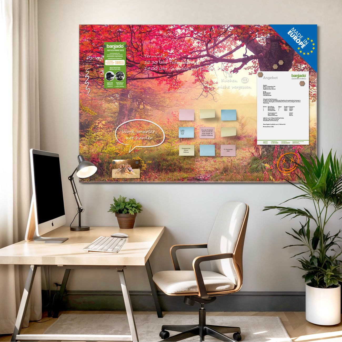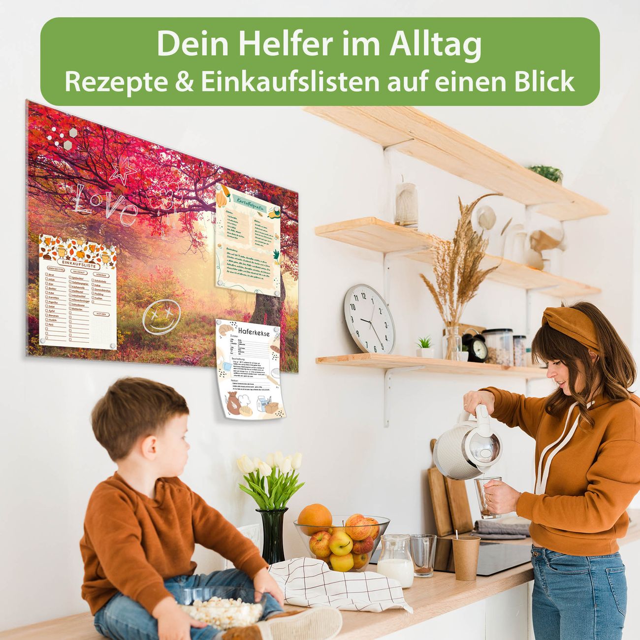 Die banjado Glas Magnettafel mit dem Motiv Motiv Lichtung Im Herbst verbindet Funktionalität mit Stil. Sie ersetzt das Zettelchaos durch klare Strukturen und bringt dabei eine warme, natürliche Atmosphäre in Ihr Zuhause. Ob im Büro, in der Küche oder im Eingangsbereich - dieses Design-Board zieht Blicke an und sorgt für Ordnung mit Charakter.