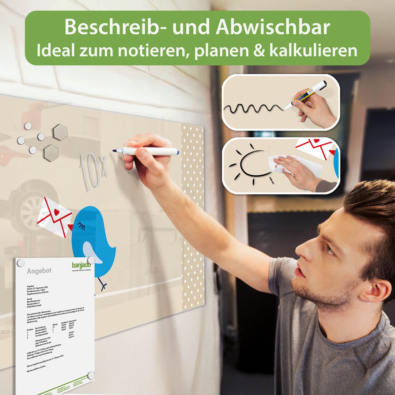 Bitte beachten Sie, dass ausschliessliche spezielle Magnete an der Glastafel haften. Wir empfehlen banjado Neodym Magnete, diese sind durch uns auf Wirksamkeit geprüft.