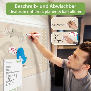 Auf der glatten Glasoberfläche lassen sich Termine, Rezepte oder Notizen ganz einfach mit Kreidestiften festhalten und rückstandslos entfernen. Starke Neodym-Magnete halten Ihre wichtigsten Erinnerungen sicher an Ort und Stelle. So entsteht Ihre ganz persönliche Ideenwand - jeden Tag neu.
