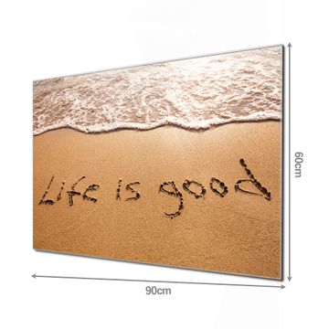 Material: 4mm Sicherheitsglas mit Metallrückwand Eigenschaften: beschreibbar, magnetisch, kratzfest Maße: 90x60x0,6cm, 8,10kg schwer Motiv Nummer 11140 Life Is Good Zubehör: inklusive 4 Neodym-Magnete