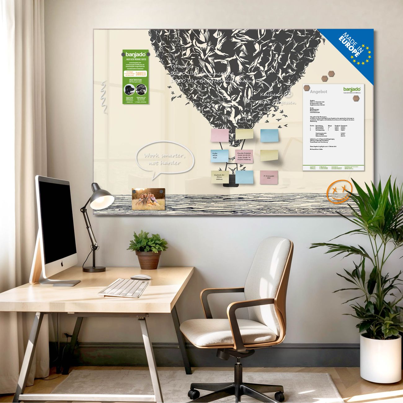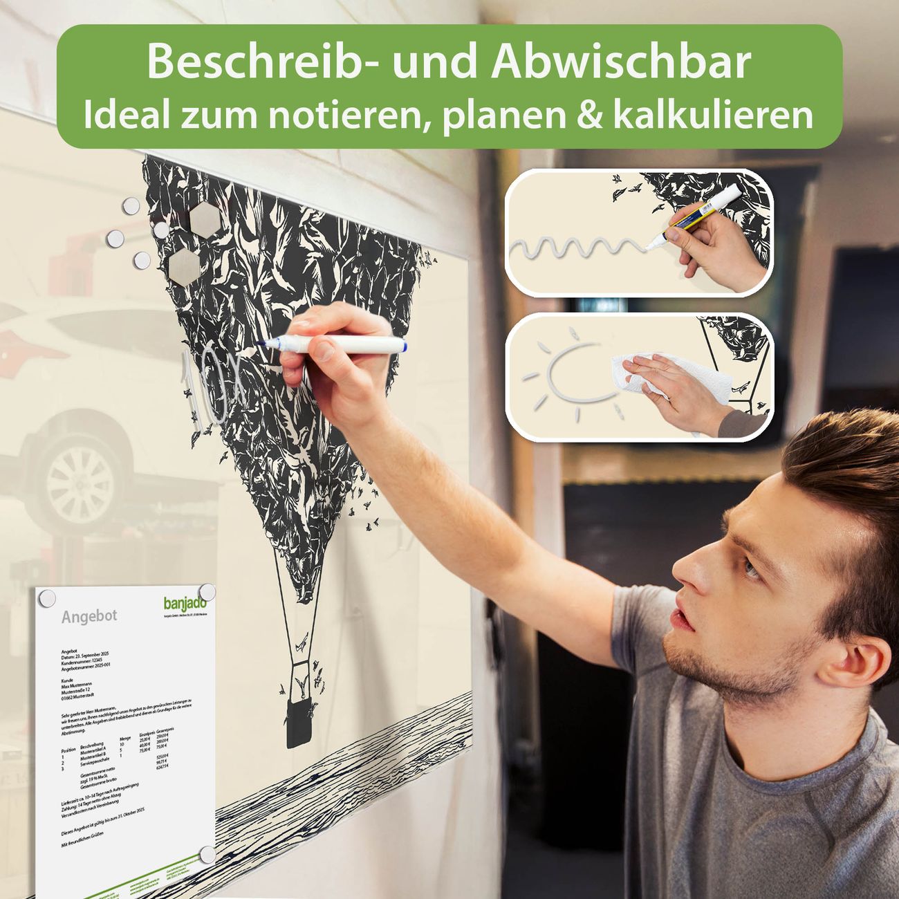 Jede Glas Magnettafel wird in unserer Werkstatt von Hand gefertigt und sorgfältig geprüft. So erhalten Sie ein echtes Qualitätsprodukt, das Funktion und Ästhetik perfekt vereint.?? Warum banjado?