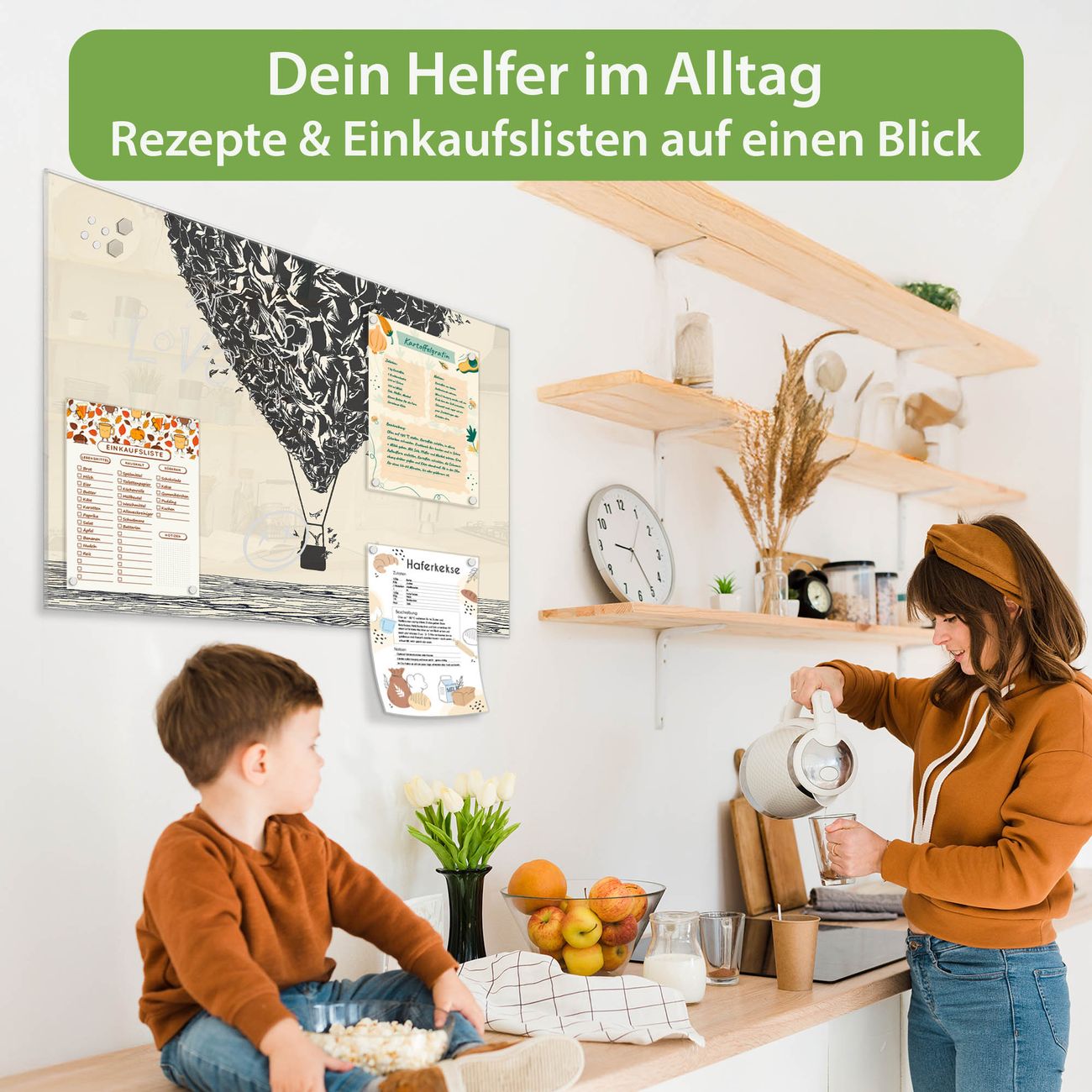 Auf der glatten Glasoberfläche lassen sich Termine, Rezepte oder Notizen ganz einfach mit Kreidestiften festhalten und rückstandslos entfernen. Starke Neodym-Magnete halten Ihre wichtigsten Erinnerungen sicher an Ort und Stelle. So entsteht Ihre ganz persönliche Ideenwand - jeden Tag neu.