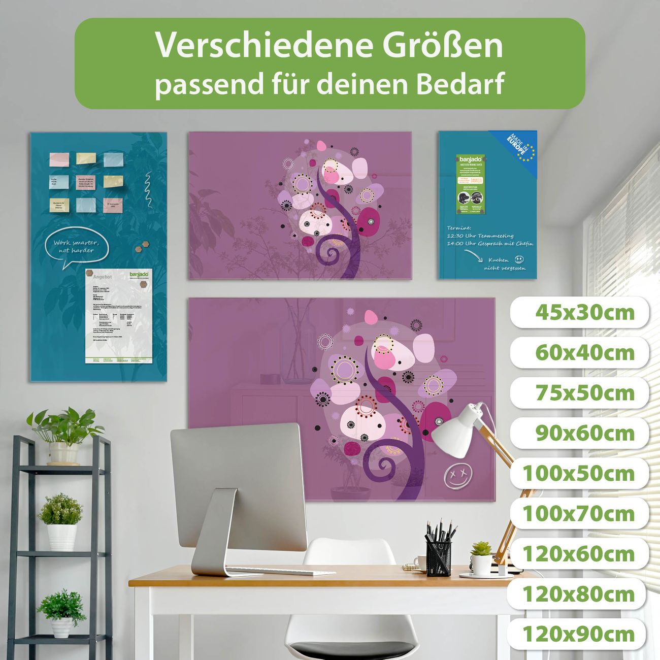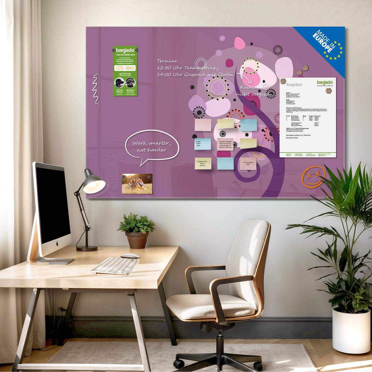 Jede Glas Magnettafel wird in unserer Werkstatt von Hand gefertigt und sorgfältig geprüft. So erhalten Sie ein echtes Qualitätsprodukt, das Funktion und Ästhetik perfekt vereint.?? Warum banjado?