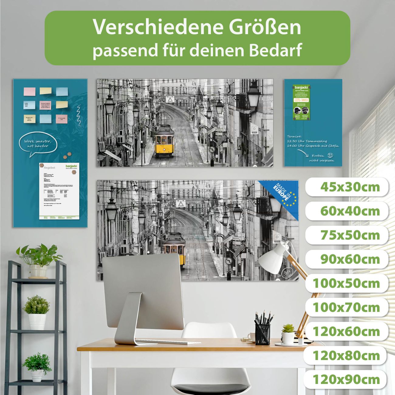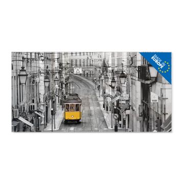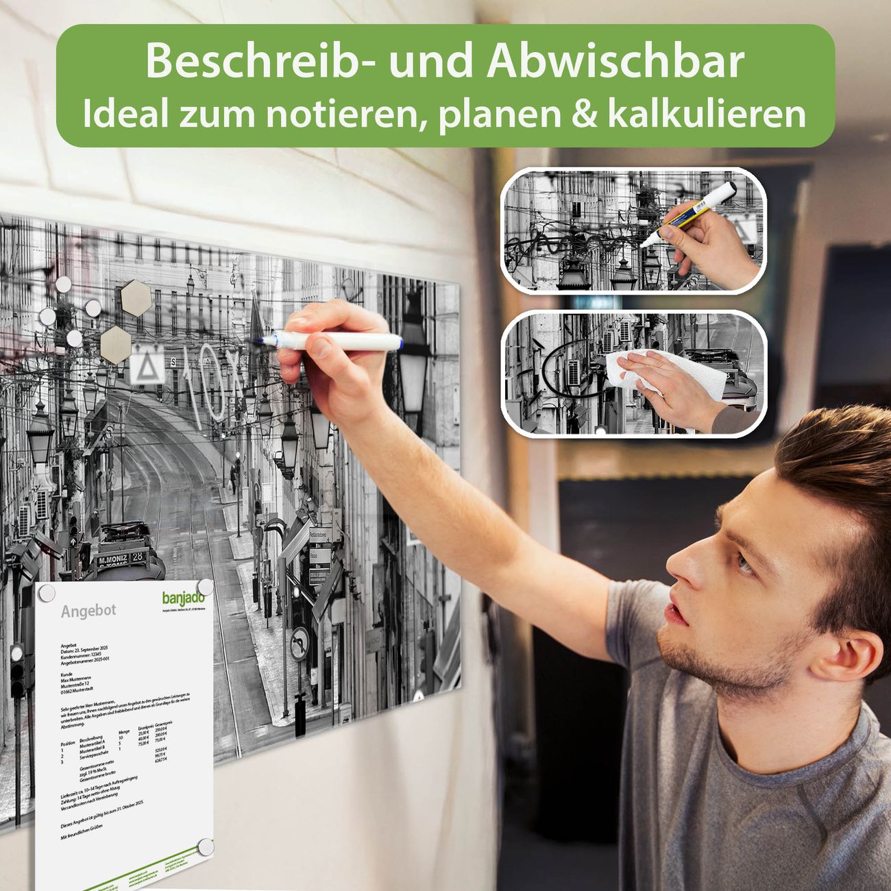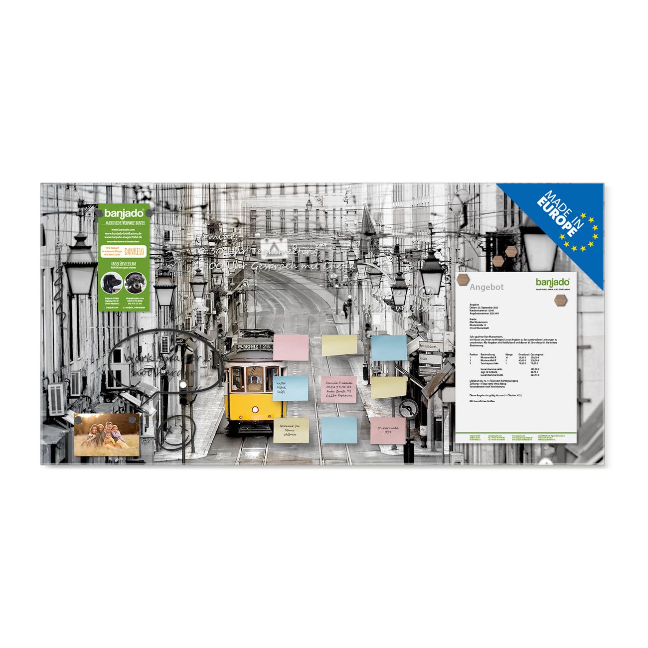 Material: 4mm Sicherheitsglas mit Metallrückwand Eigenschaften: beschreibbar, magnetisch, kratzfest Maße: 120x60x0,6cm, 10,80kg schwer Motiv Nummer 11113 Lissabon Zubehör: inklusive 4 Neodym-Magnete