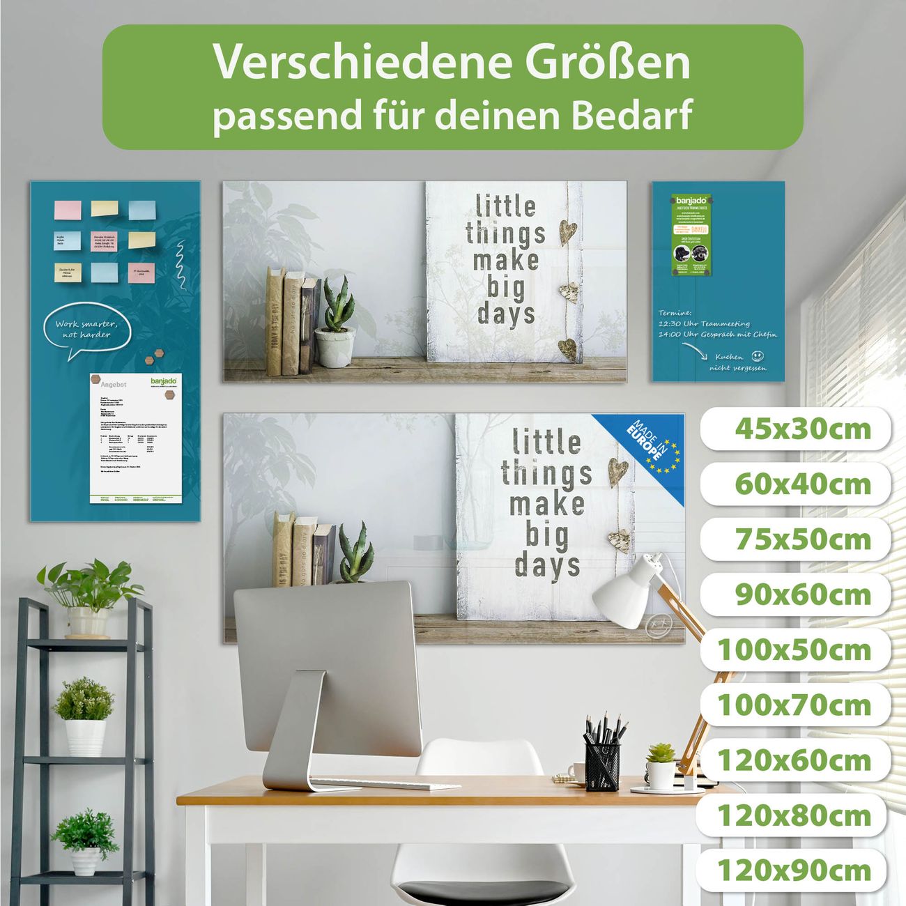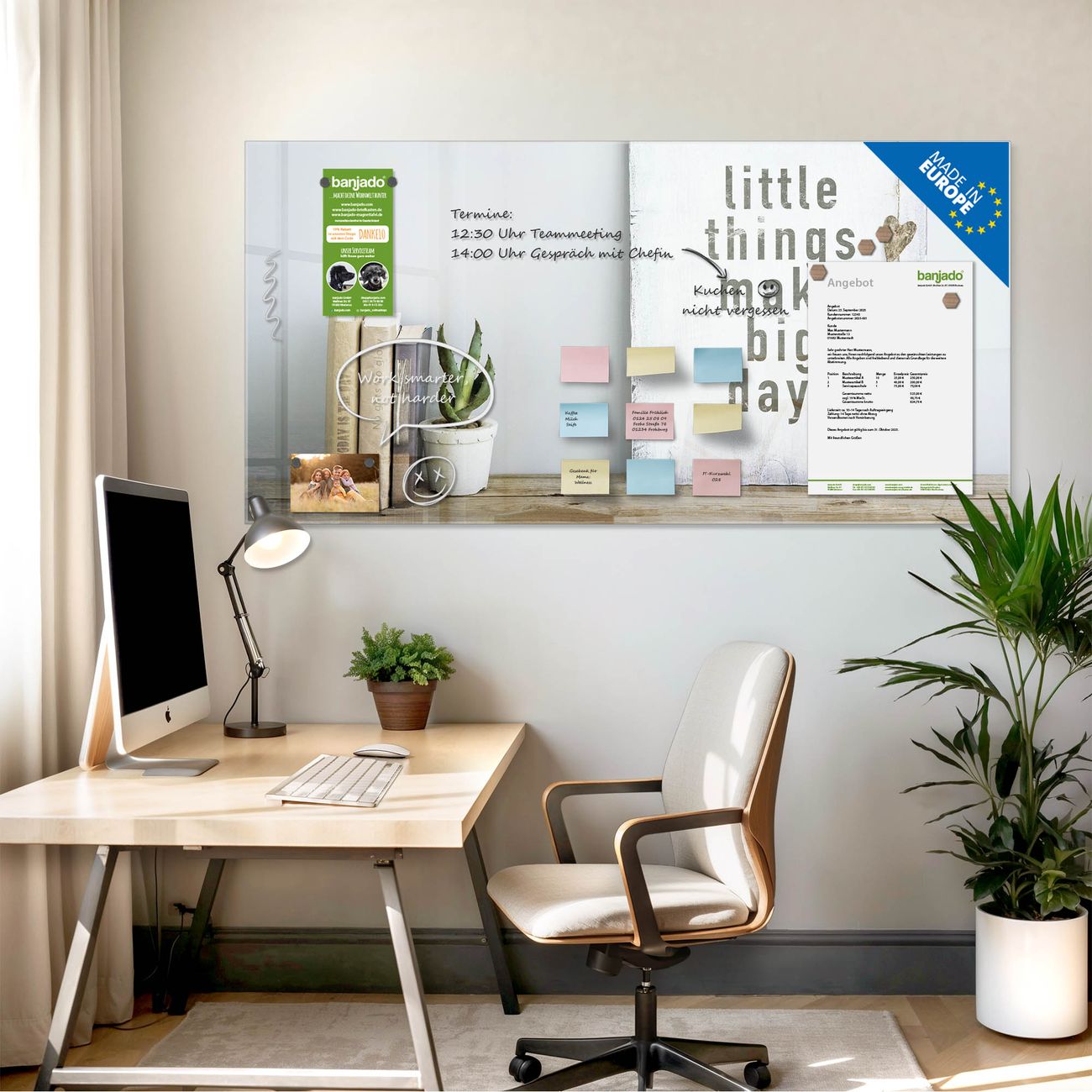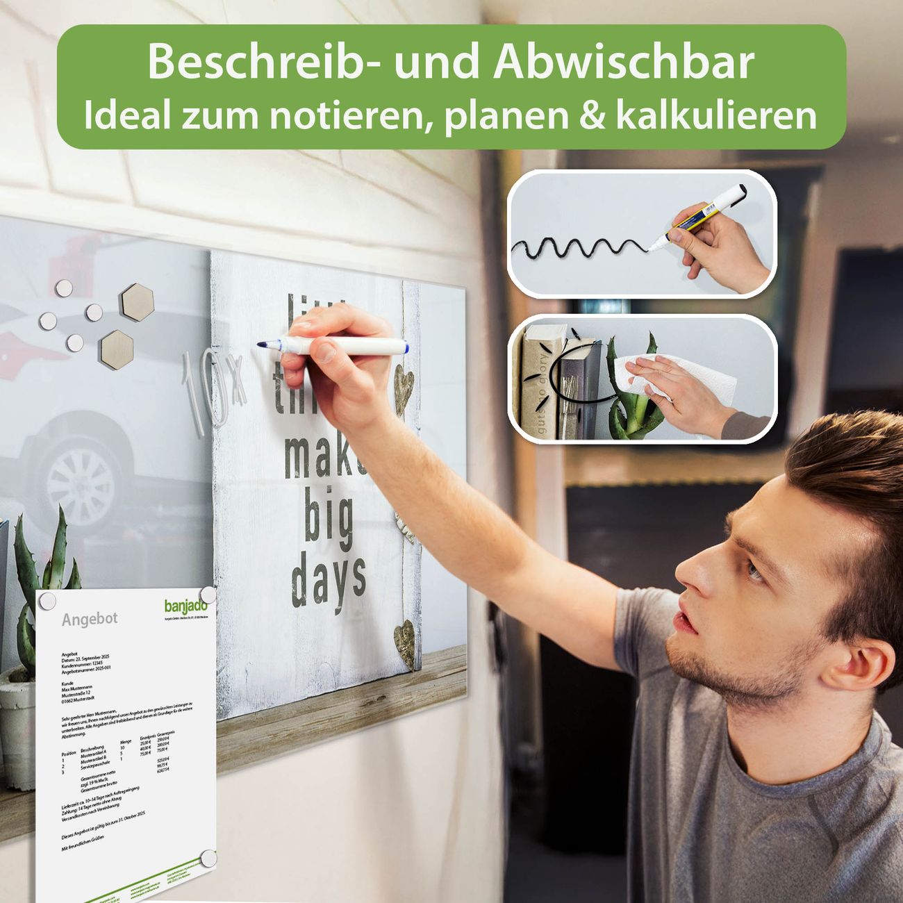 Jede Glas Magnettafel wird in unserer Werkstatt von Hand gefertigt und sorgfältig geprüft. So erhalten Sie ein echtes Qualitätsprodukt, das Funktion und Ästhetik perfekt vereint.?? Warum banjado?