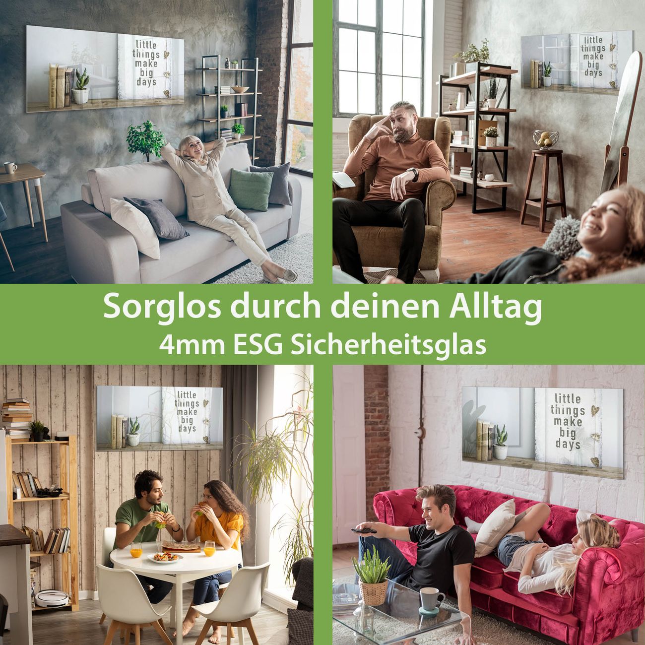 Material: 4mm Sicherheitsglas mit Metallrückwand Eigenschaften: beschreibbar, magnetisch, kratzfest Maße: 120x60x0,6cm, 10,80kg schwer Motiv Nummer 12708 Little Things Zubehör: inklusive 4 Neodym-Magnete