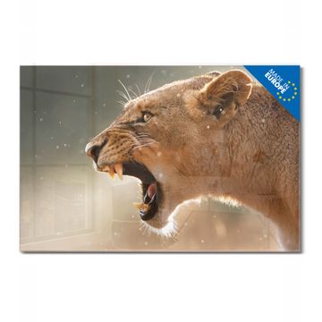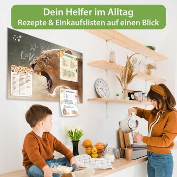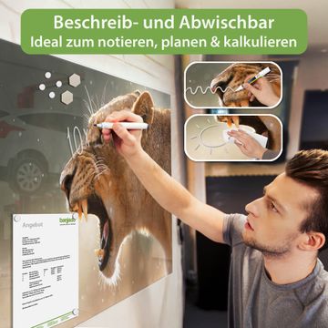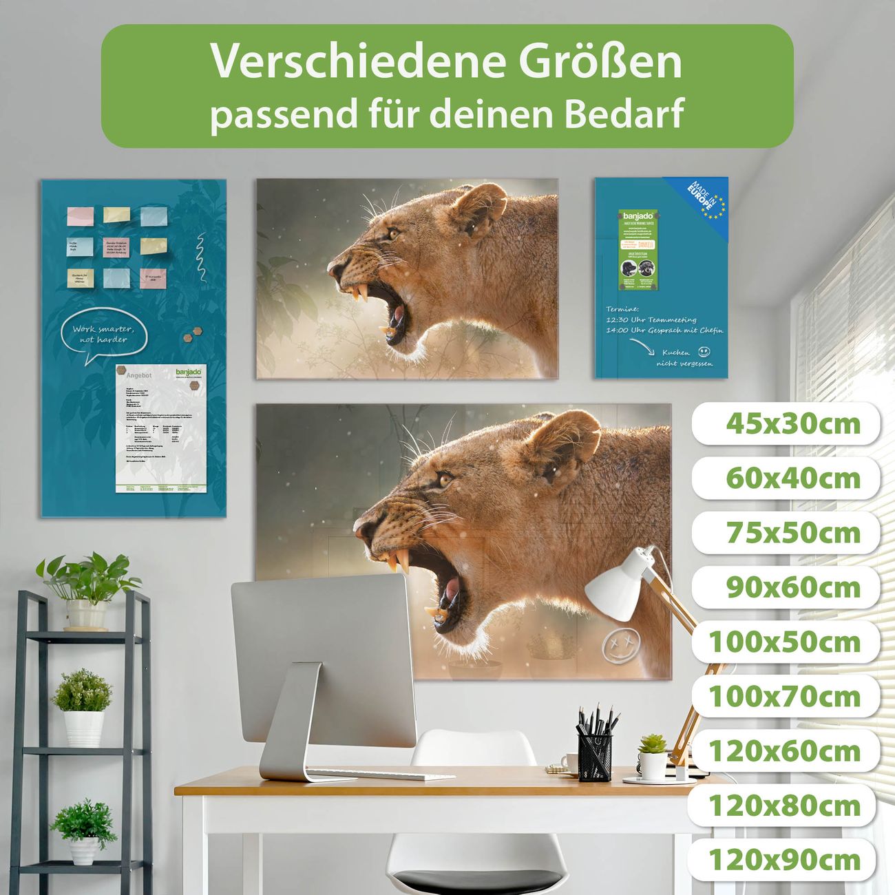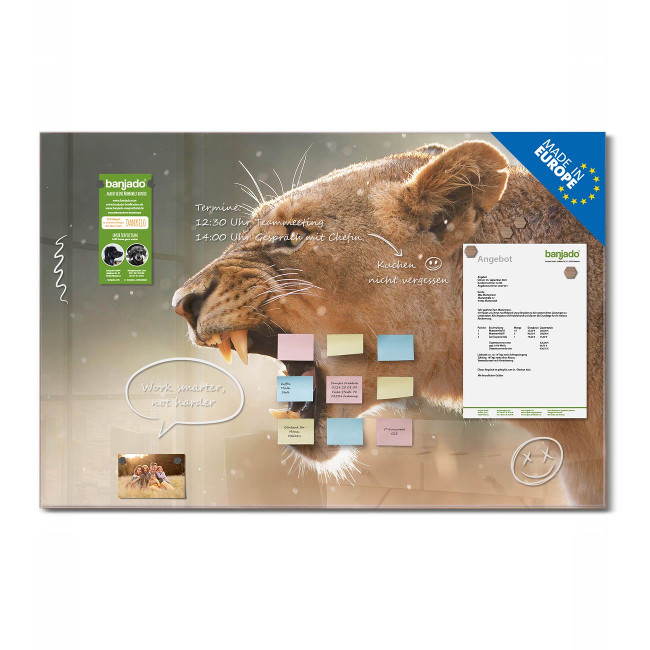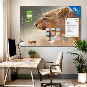 Material: 4mm Sicherheitsglas mit Metallrückwand Eigenschaften: beschreibbar, magnetisch, kratzfest Maße: 90x60x0,6cm, 8,10kg schwer Motiv Nummer 12360 Löwin Zubehör: inklusive 4 Neodym-Magnete